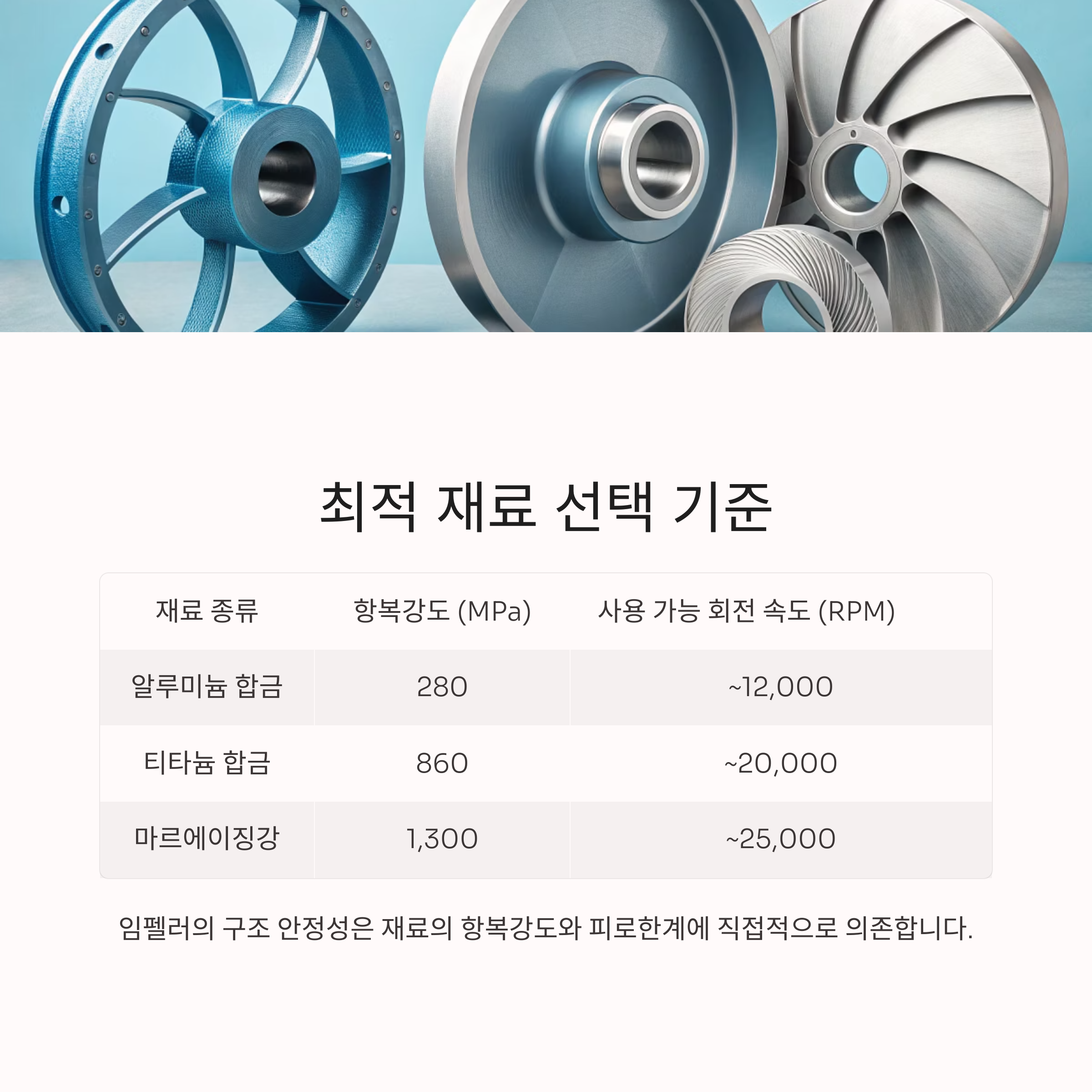 임펠러의 구조 안정성은 재료의 항복강도와 피로한계에 직접적으로 의존합니다. 재료 선택 시 다음 기준을 충족해야 합니다:
