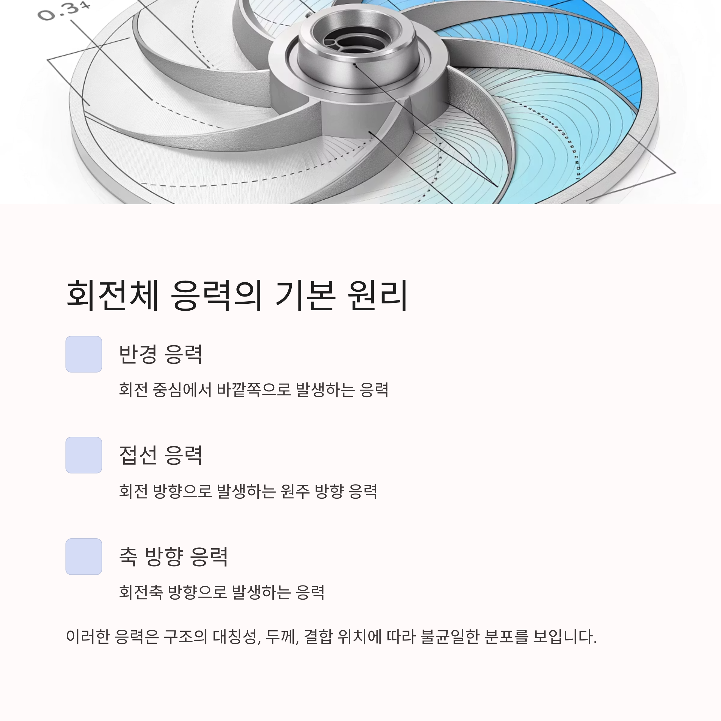 수천 RPM에서 발생하는 원심력에 의해 발생하는 응력은 재료 파손을 초래할 수 있으므로, 정확한 응력 해석 및 구조적 안정성 평가는 설계 단계에서 필수적입니다.
