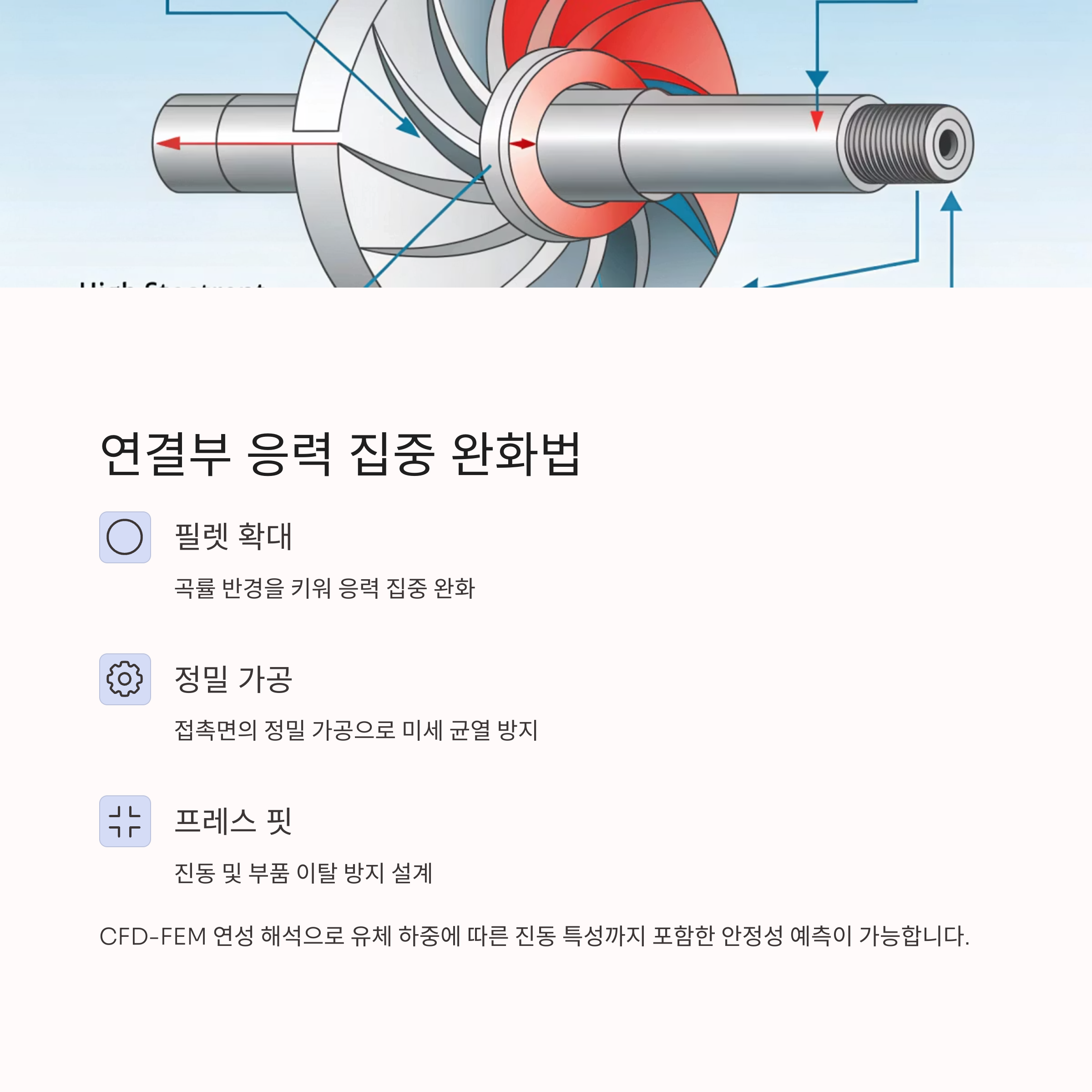 임펠러와 샤프트의 연결부는 설계상 가장 큰 응력 집중 영역입니다. 키(Key), 테이퍼, 스플라인 등의 연결 방식이 사용되며, 다음과 같은 전략으로 응력을 완화할 수 있습니다: