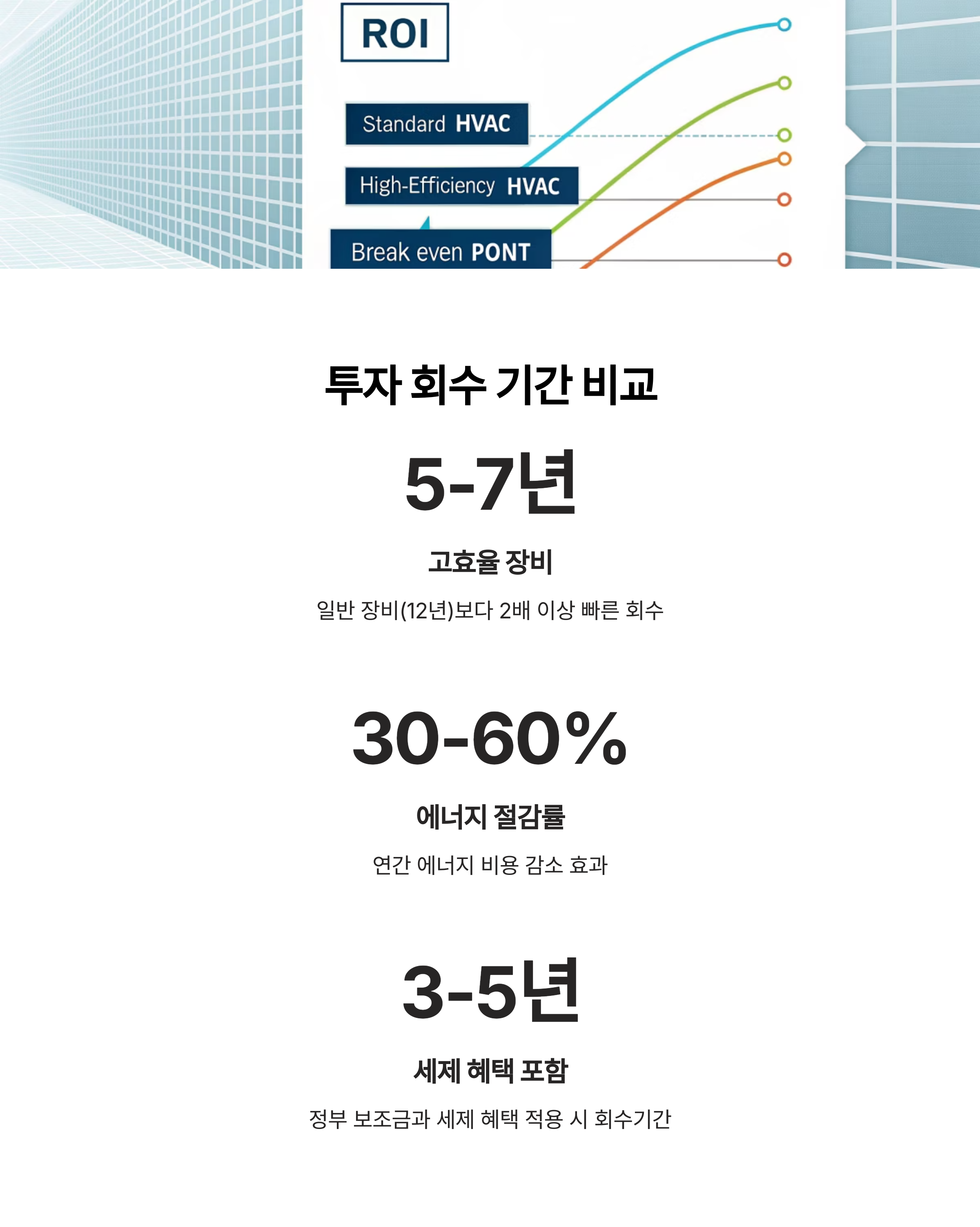 표에서 보듯, 고효율 장비는 초기비용은 크지만 에너지비 절감, 정부 인센티브, 장기적 유지보수비용 감소 등에서 탁월한 성과를 보입니다. 특히 대형 상업시설이나 냉난방 운영시간이 긴 환경에서는 ROI 차이가 더욱 극명하게 나타납니다.