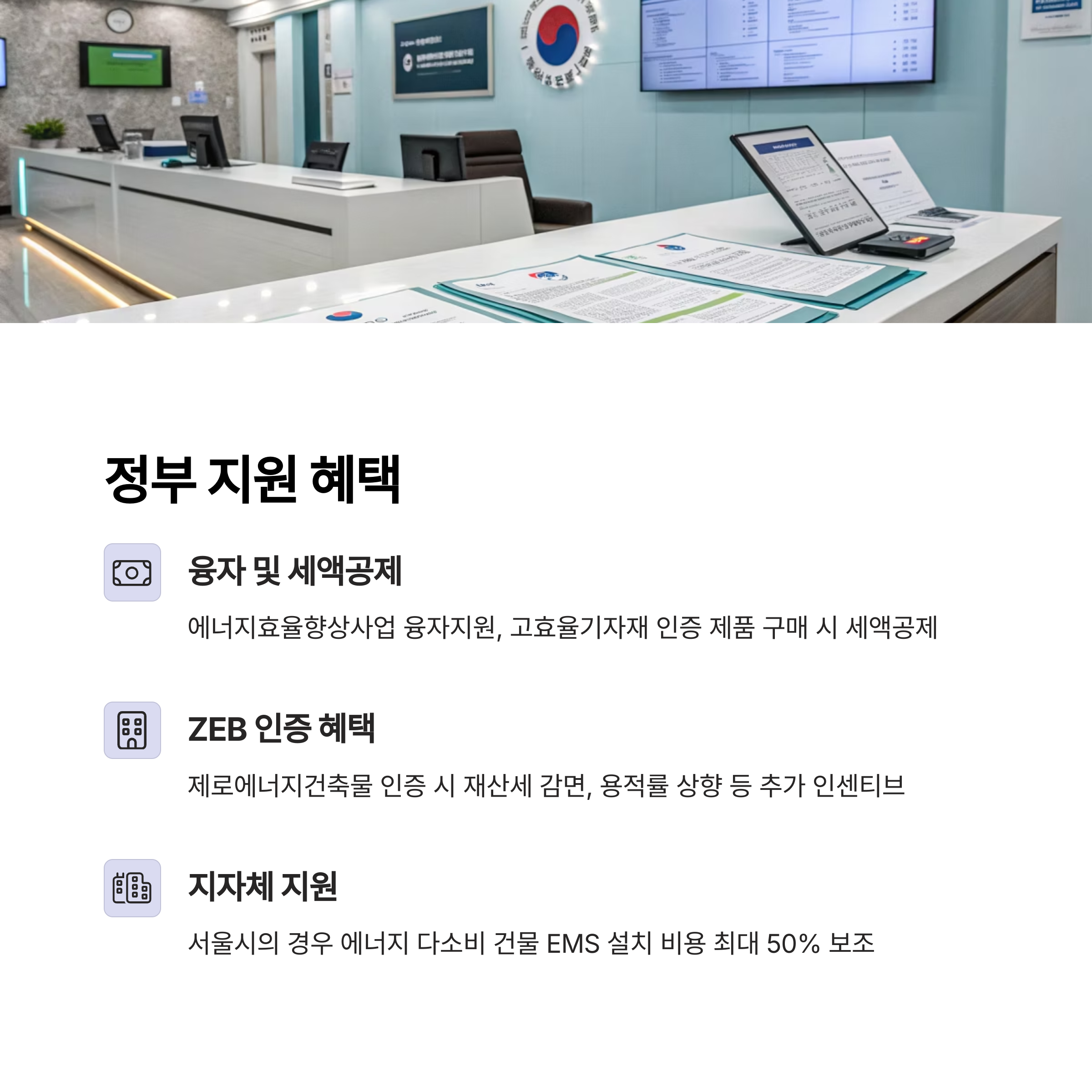 에너지효율향상사업 융자지원, 녹색건축인증 가점 혜택, 고효율기자재 인증 제품 구매 시 세액공제 등 다양한 제도가 운영 중인데요. 특히 ESS·EMS 융합 설치 시 최대 70%까지 비용 지원이 가능하고, ZEB(제로에너지건축물) 인증을 받으면 재산세 감면, 용적률 상향 등 추가적인 인센티브도 주어집니다.