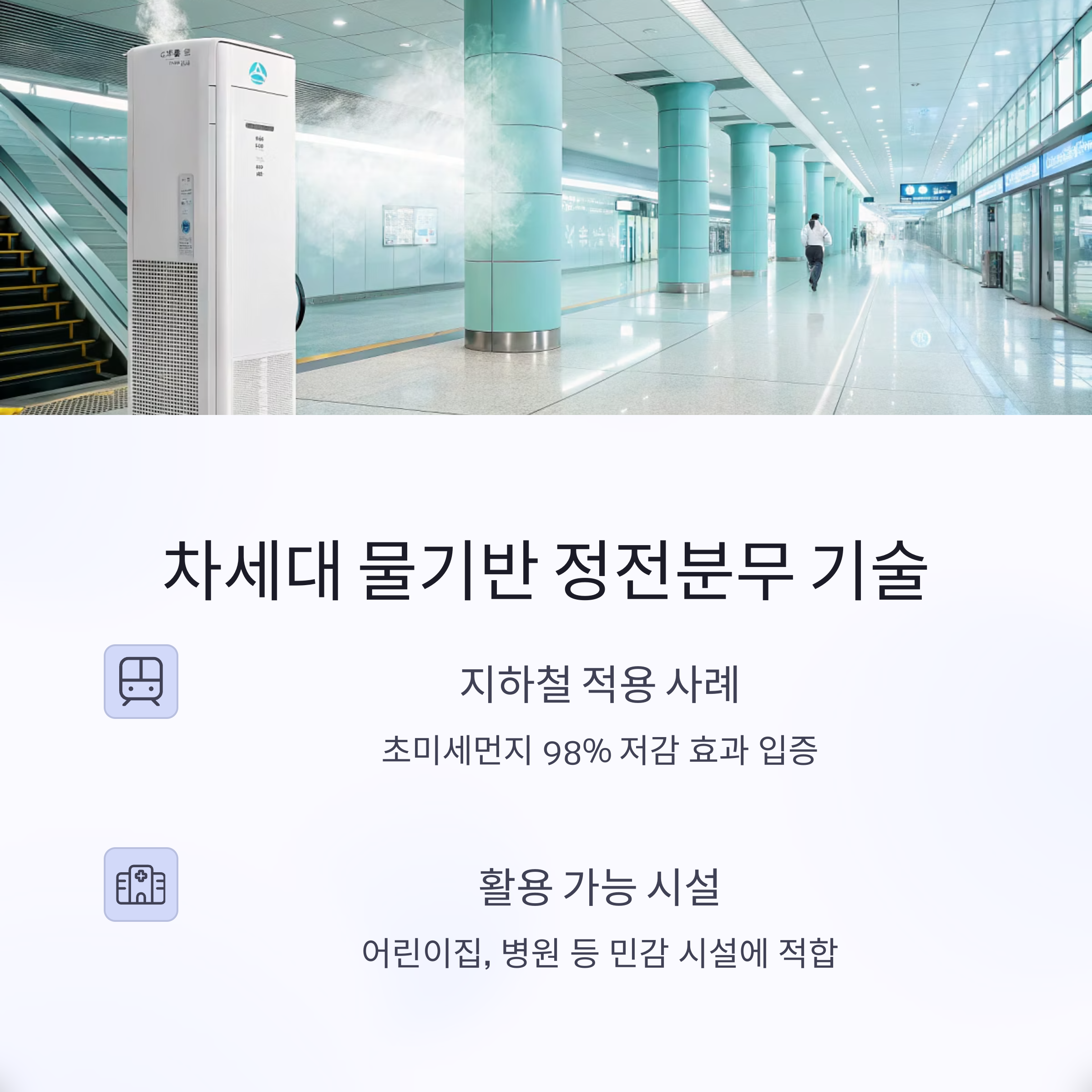 또한, 차세대 기술로 주목받는 물기반 정전분무 공기청정 기술은 최대 미세먼지 98% 제거율을 기록하며 주목받고 있습니다.