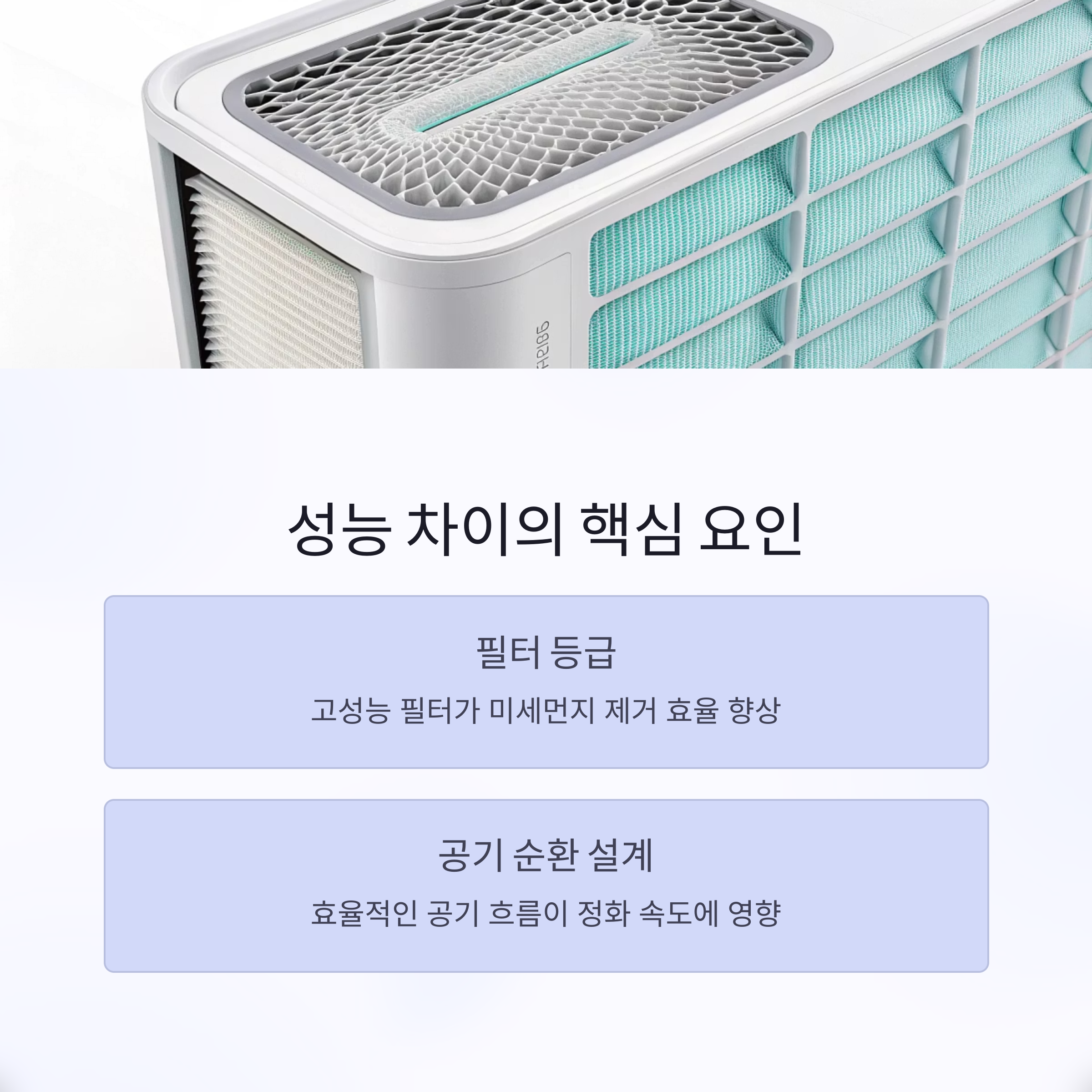 데이터 분석 결과 필터 등급 및 공기 순환 설계가 성능 차이에 큰 영향을 미치는 주요 요인으로 나타났습니다.