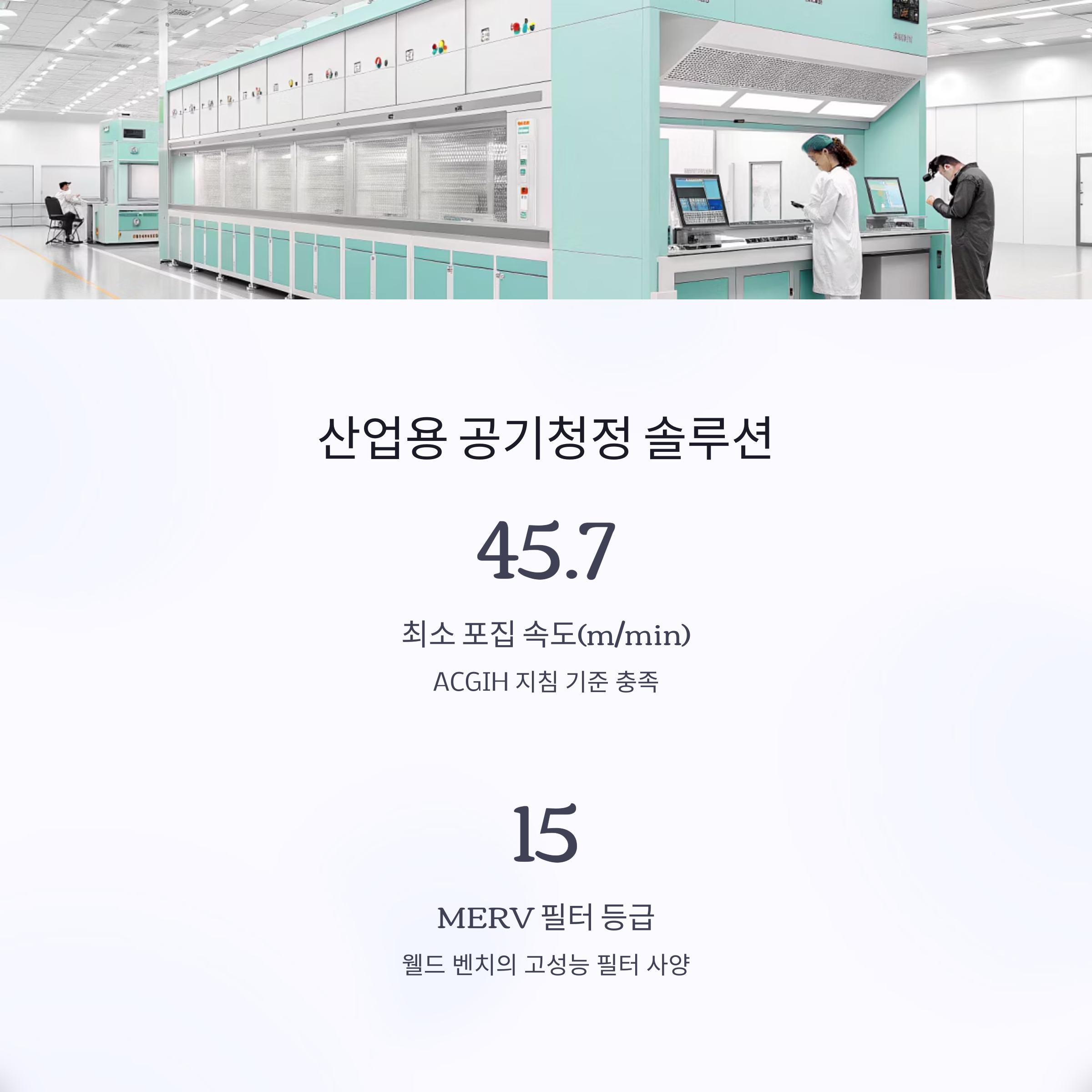 주요 산업용 공기청정벤치(웰드 벤치)는 ACGIH 지침을 준수하며 안전성을 높였습니다.