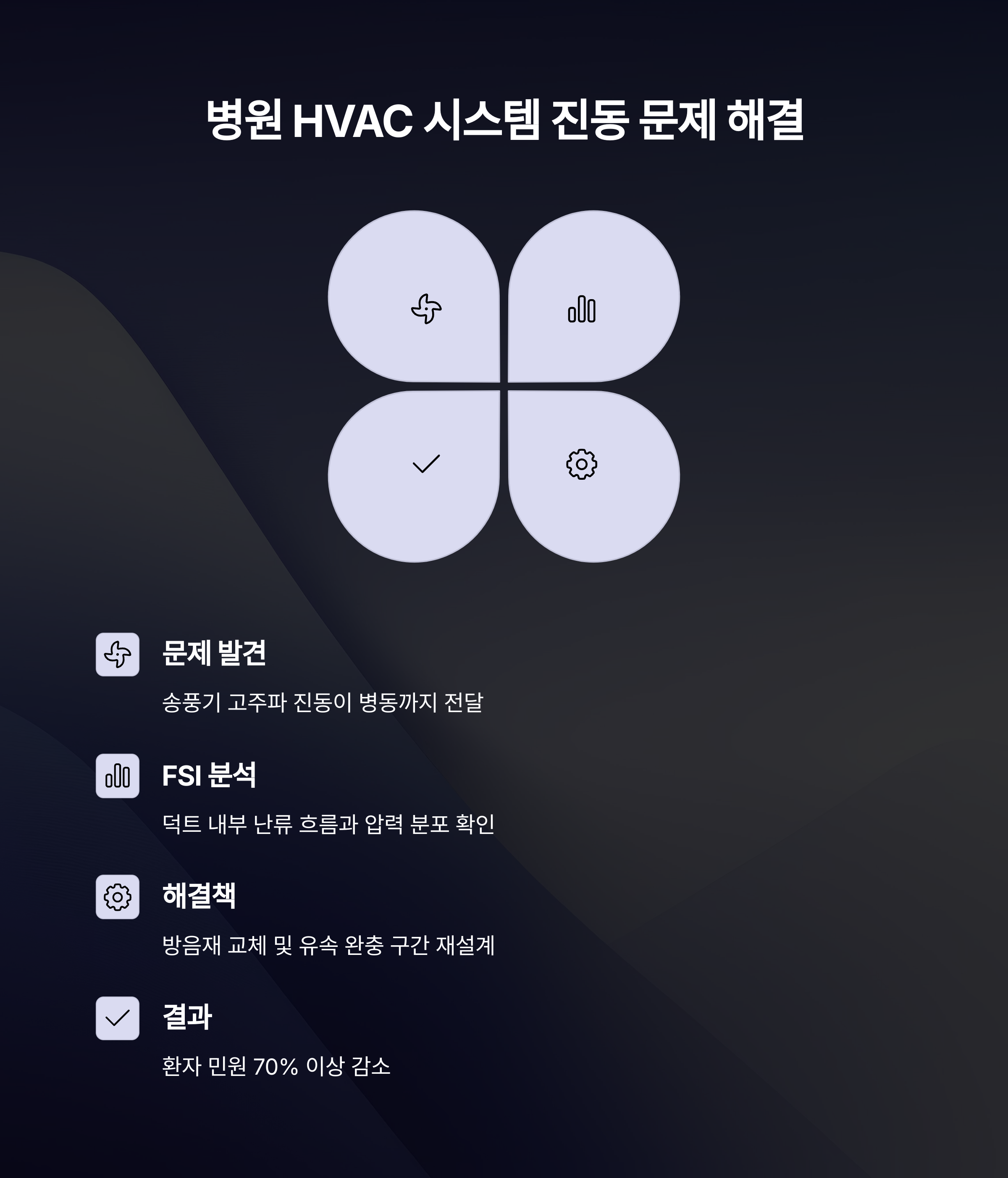송풍기의 고주파 진동이 덕트를 통해 병동까지 전달되는 문제가 발생했습니다.