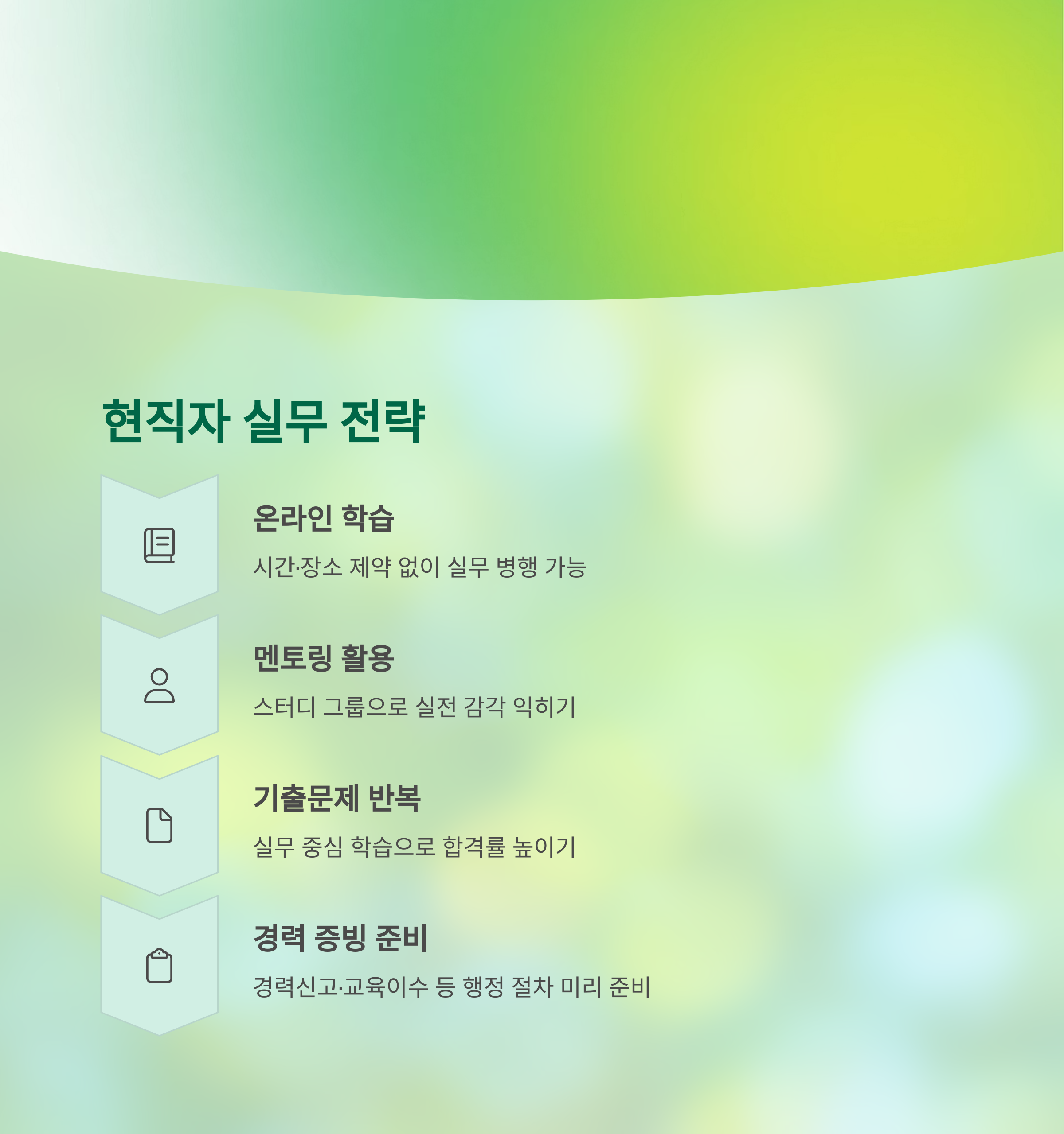 또한 멘토링과 스터디 그룹을 통해 실전 감각을 익히고, 경력 증빙서류도 미리 준비해 경력신고 절차에 차질이 없도록 해야 합니다.