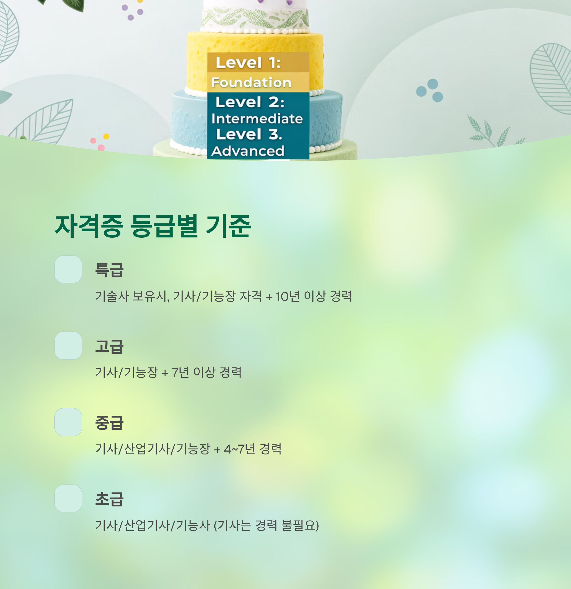 자격증 등급 특급, 고급, 중급, 초급으로 구분되며 자격증 및 경력 기준 상이