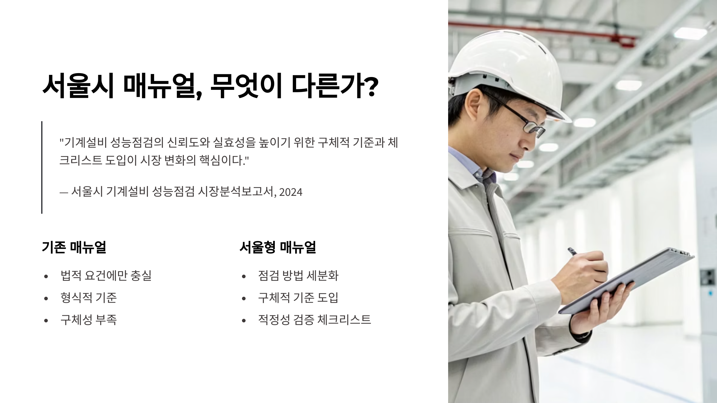 바로 이런 시장의 불신과 혼란 속에서, 서울시가 선도적으로 내놓은 ‘서울형 기계설비 성능점검보고서 표준 매뉴얼’이