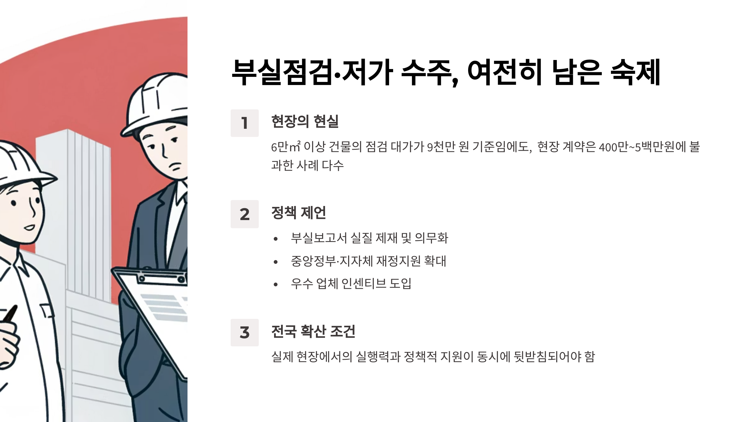 제도가 좋아져도 현장에선 여전히 저가 수주와 부실점검이 만연합니다.
