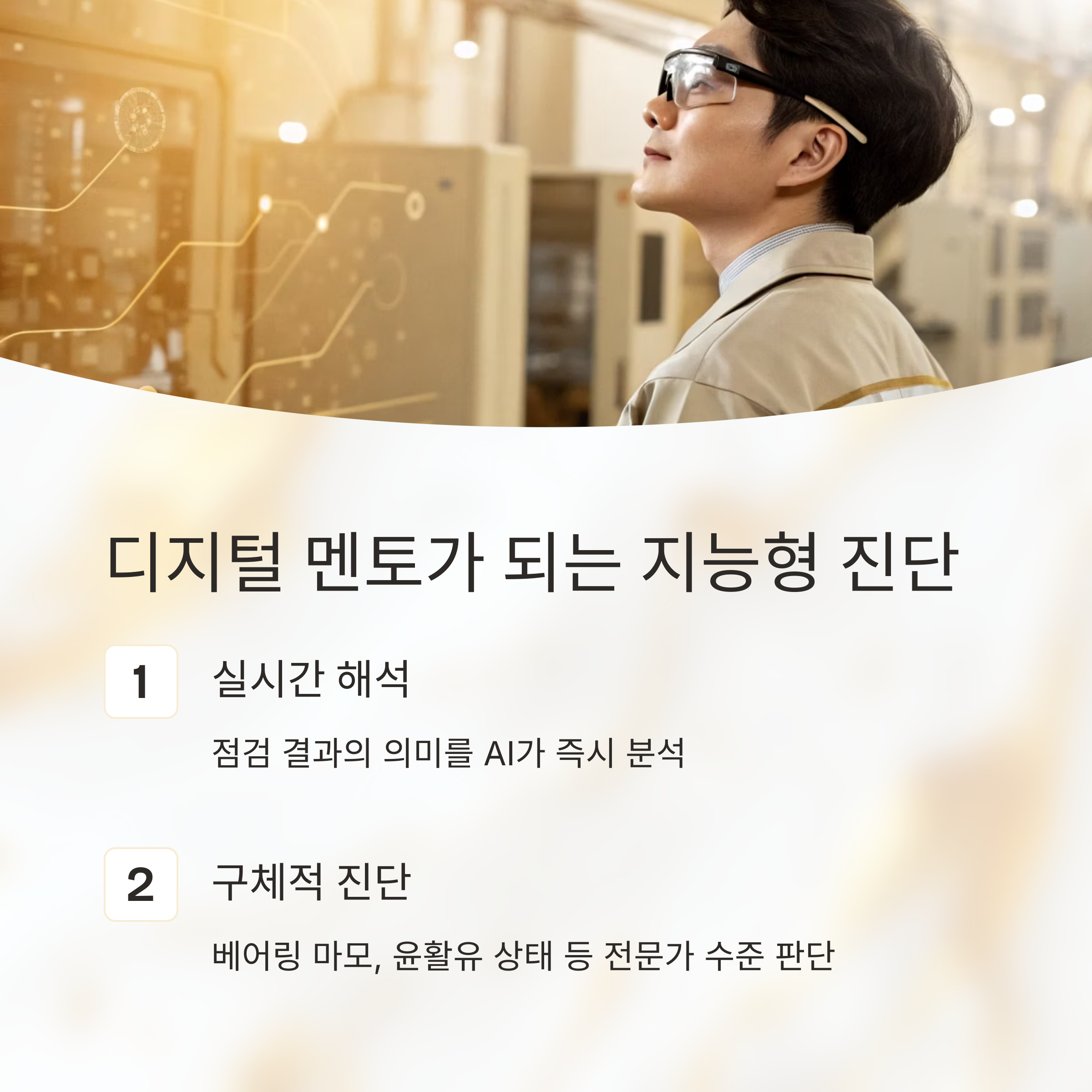 베어링 마모 가능성, 윤활유 상태 등 구체적인 진단까지 실시간으로 제공하며, 숙련 기술자의 경험 부족을 디지털 멘토가 메워줍니다. 이는 현장 신입 기술자에게도 전문가 수준의 판단 근거를 제공하는 혁신입니다.