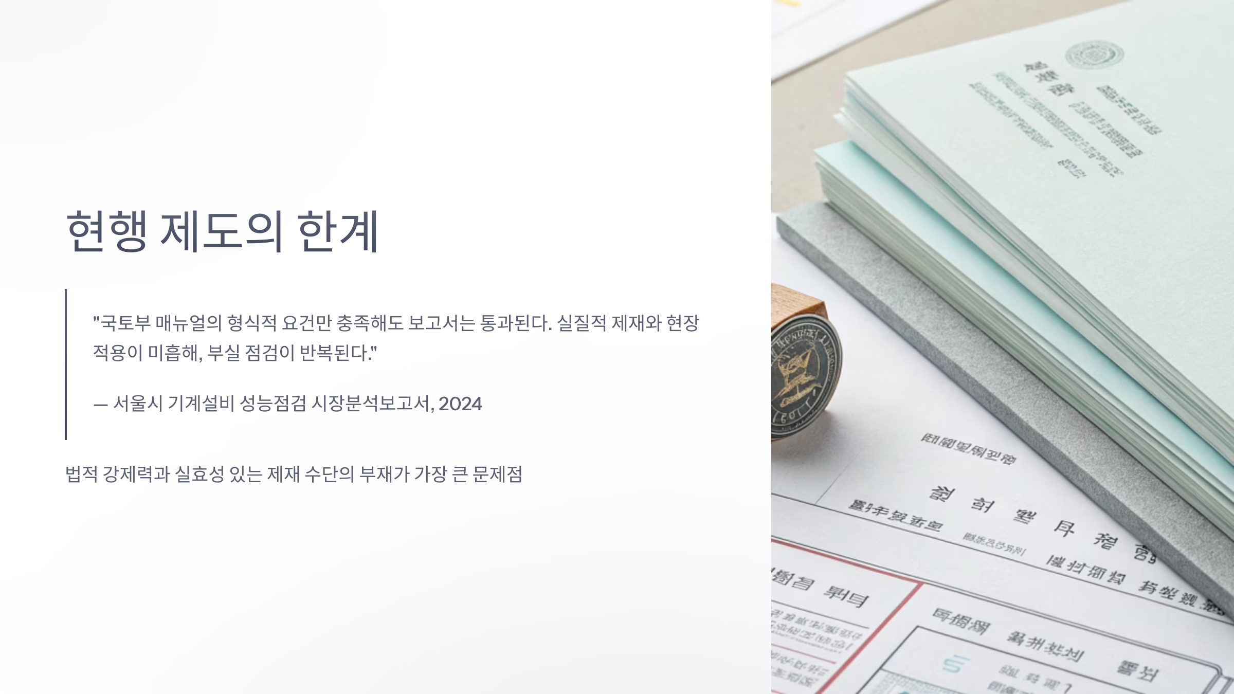 “국토부 매뉴얼의 형식적 요건만 충족해도 보고서는 통과된다. 실질적 제재와 현장 적용이 미흡해, 부실 점검이 반복된다.”