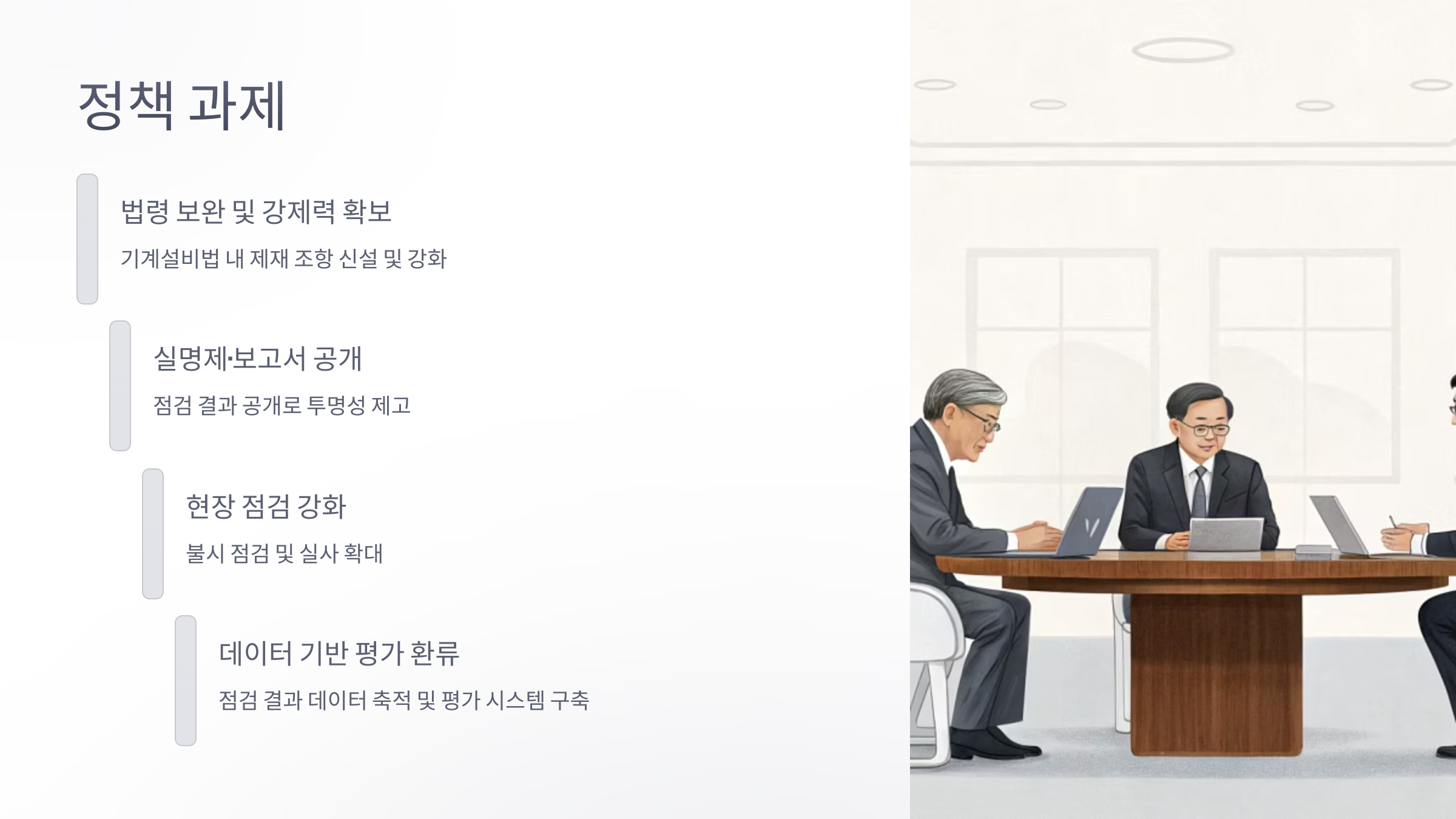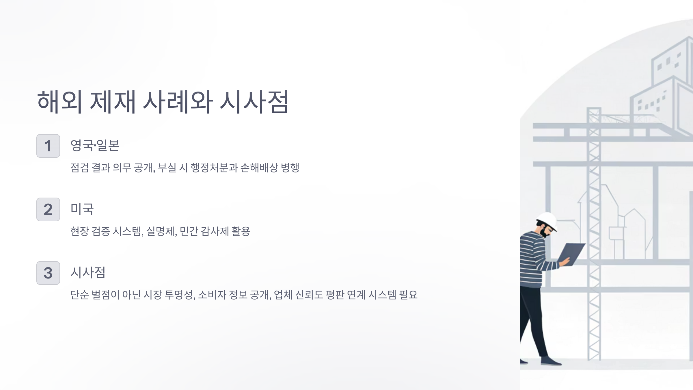 - 영국, 일본 등 선진국은 점검 결과를 의무적으로 공개하고, 부실 시 행정처분과 손해배상까지 병행