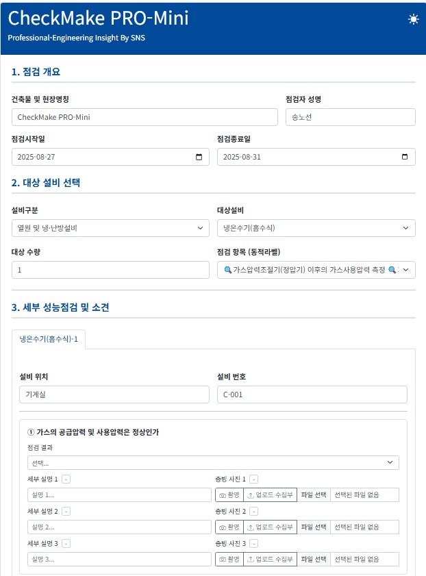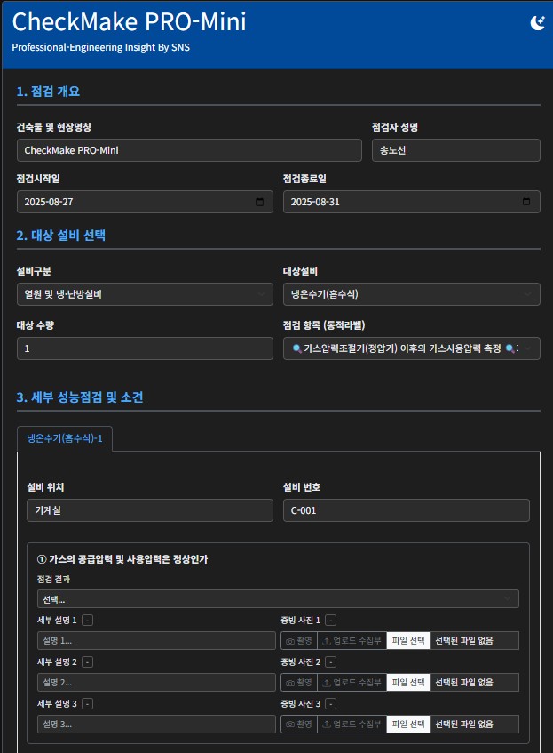 A4) 물론입니다. 이 솔루션은 IT 전문가가 아닌 현장 기술자분들을 위해 설계되었습니다.복잡한 기능은 모두 배경에서 자동으로 돌아가고, 사용자에게는 간단한 입력창과 버튼만 보입니다. 특히 여러 설비를 오가며 점검하는 상황을 고려한 '다중 설비 탭' 인터페이스는 오히려 기존 앱보다 훨씬 직관적이고 편리하다고 느끼실 겁니다.