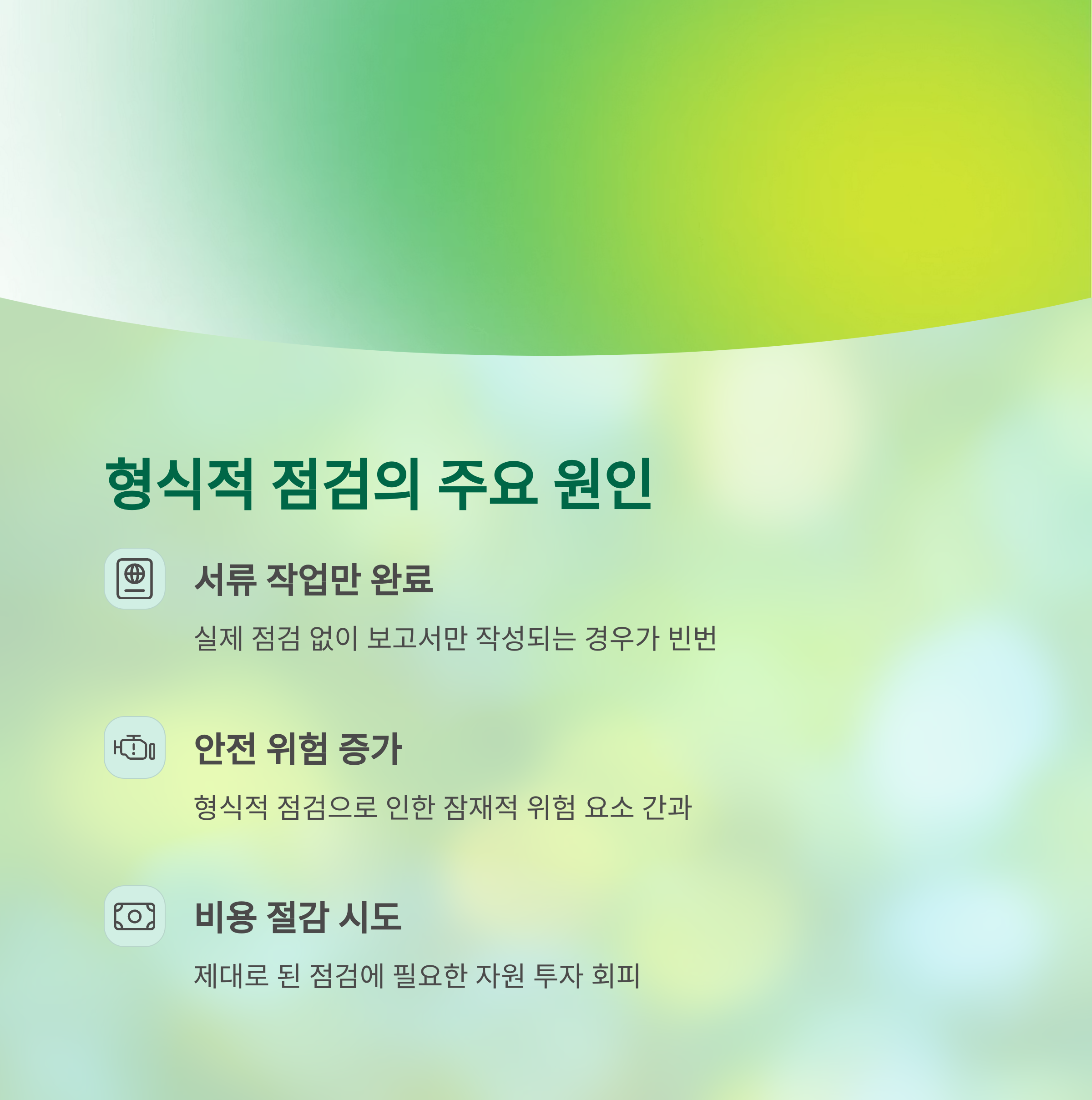 그러나 이러한 제도적 개선에도 불구하고, 현장에서는 여전히 형식적인 점검이 일반적으로 이루어지고 있습니다.
