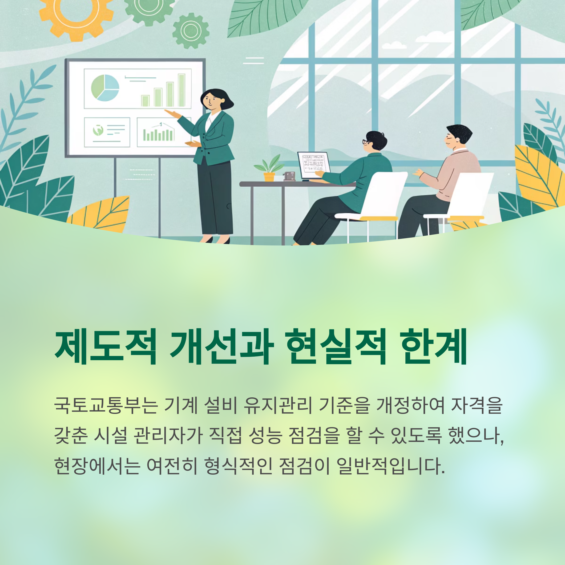이러한 문제를 해결하기 위해 국토교통부는 기계 설비 유지관리 기준을 개정하여 자격을 갖춘 시설 관리자가 직접 성능 점검을 할 수 있도록 했습니다.