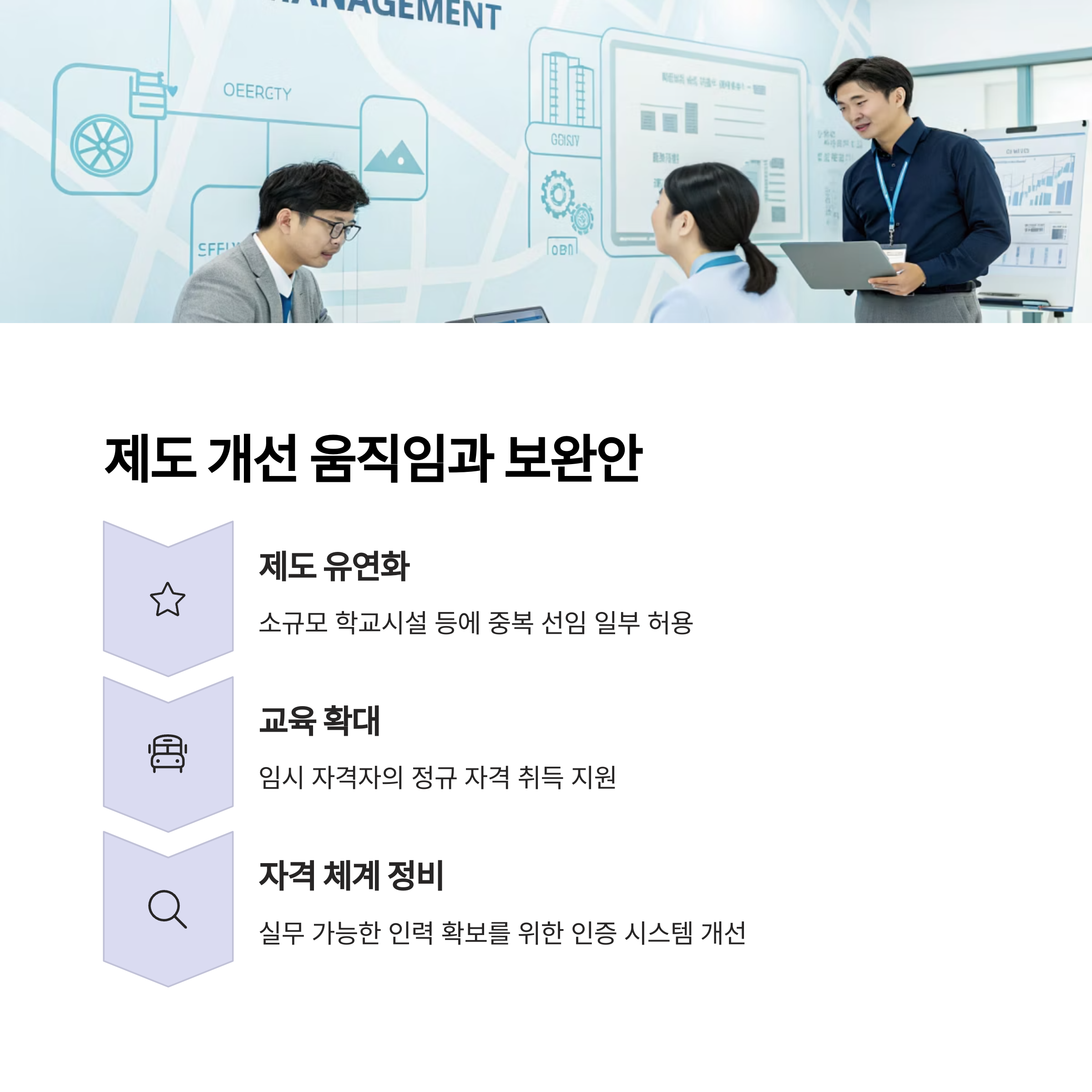 대표적으로 소규모 학교시설 등에는 중복 선임을 일부 허용하는 방향으로 제도 유연화를 시도하고 있습니다.