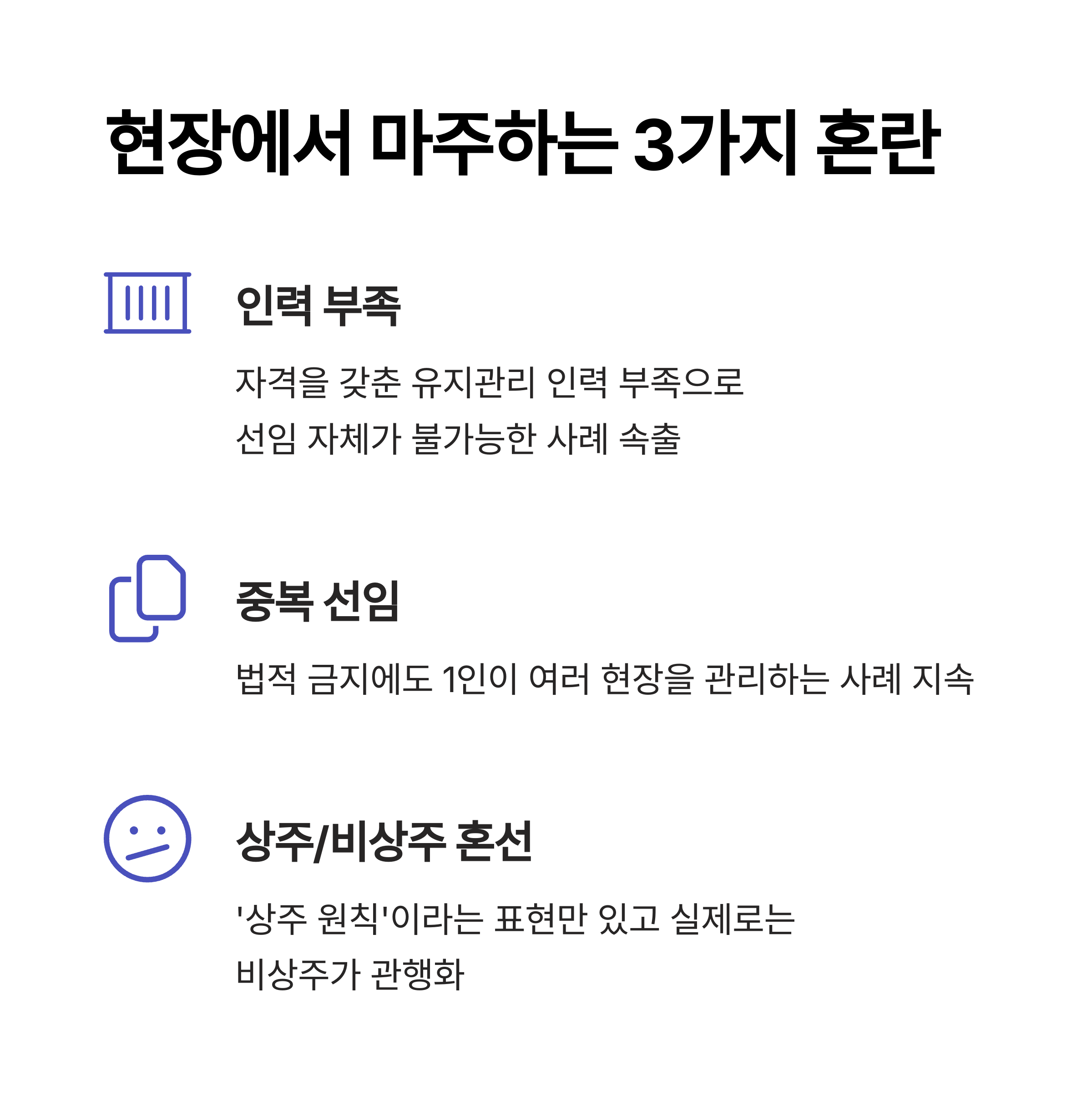 • 인력 부족 – 자격을 갖춘 유지관리 인력이 턱없이 부족해, 선임 자체가 불가능한 사례도 속출하고 있어요.