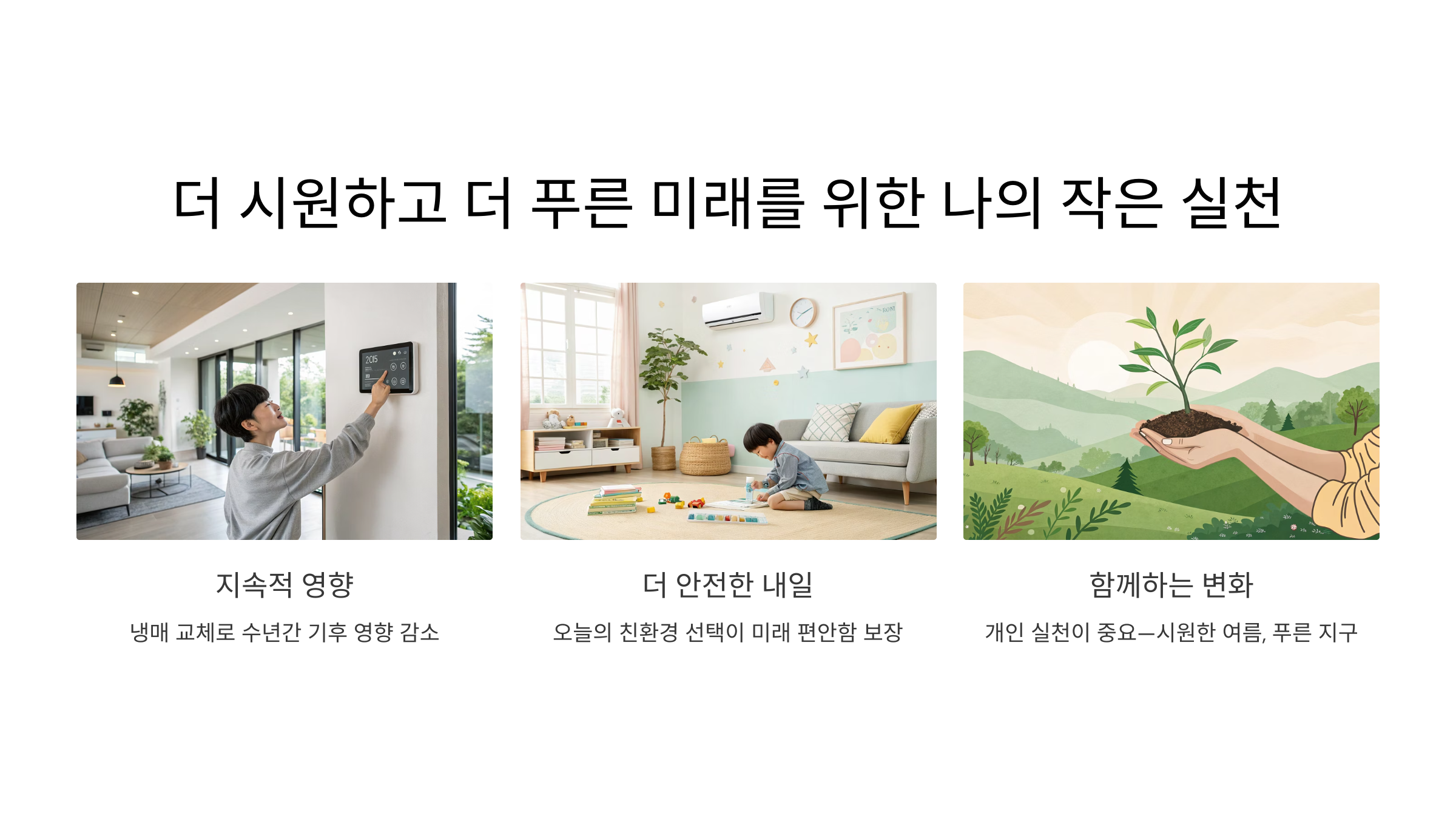 조금은 기술적이고 어려운 내용이었을 수도 있지만, 우리가 매일 누리는 시원함 뒤에 숨겨진 환경 이야기를 통해 작은 관심과 선택이 얼마나 큰 변화를 가져올 수 있는지 느끼셨으리라 생각해요. 😊