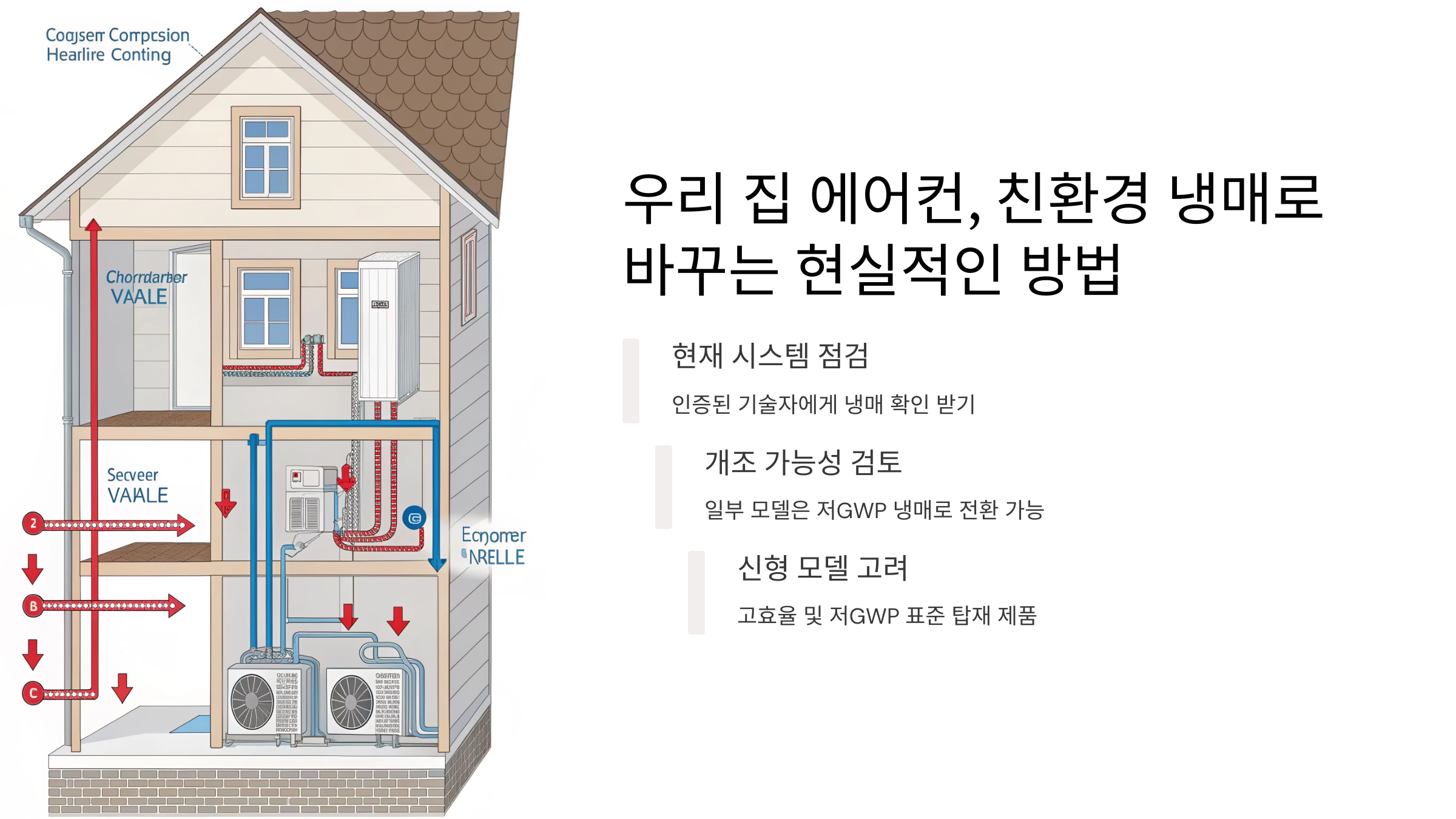 그렇다면 현실적인 방법은 무엇일까요? 가장 확실한 방법은 에어컨을 새로 구매할 때 처음부터 친환경 냉매(예: R-32)가 적용된 모델을 선택하는 것입니다.