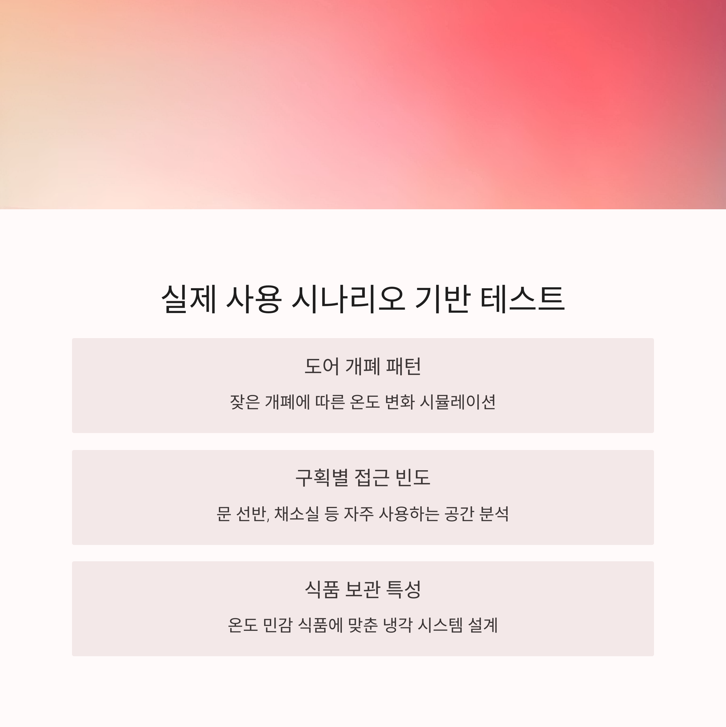 - 특정 구역(예: 도어 선반, 채소 보관실 등)의 온도 편차 분석