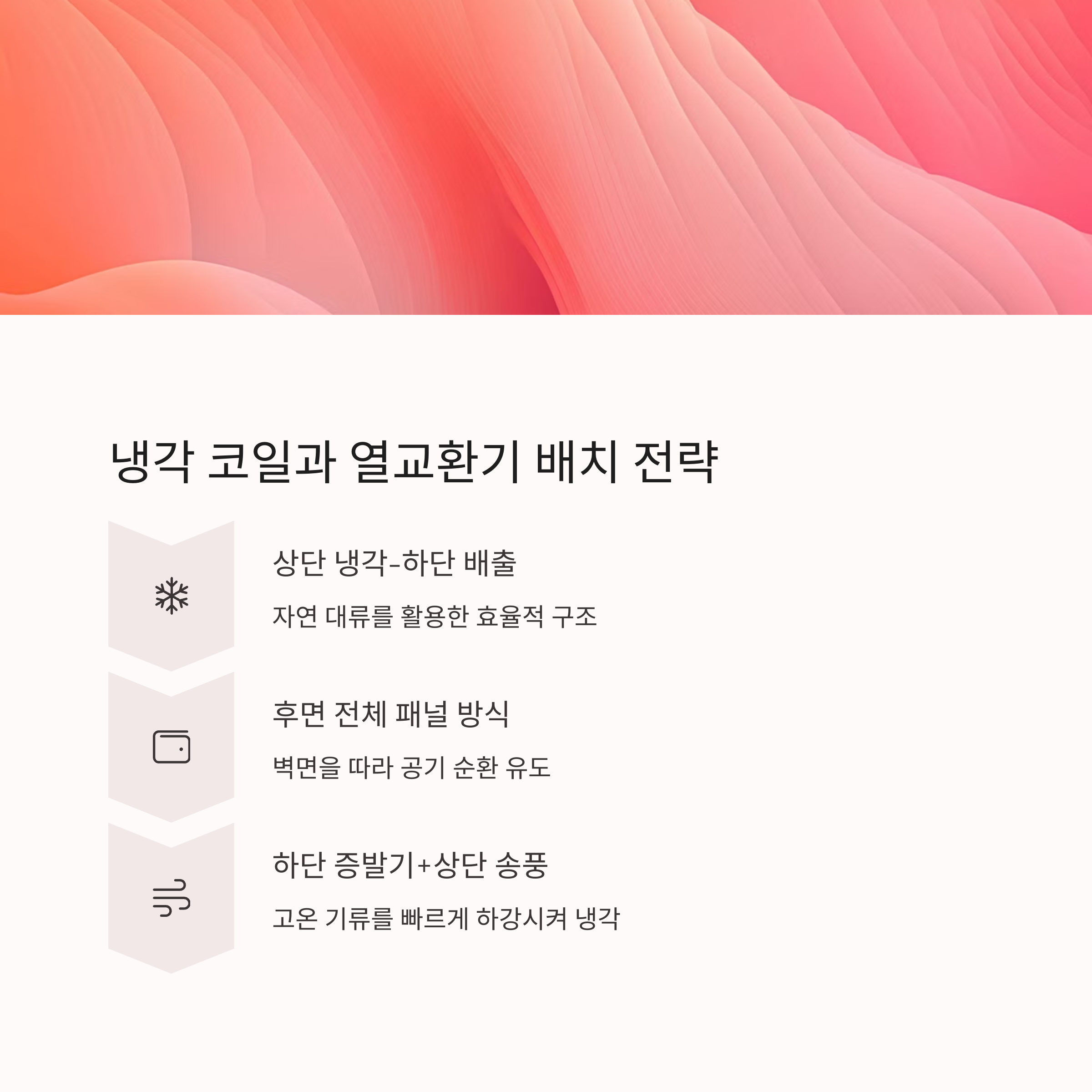 - 하단 증발기 + 상단 송풍: 고온 기류를 빠르게 하강시켜 냉각