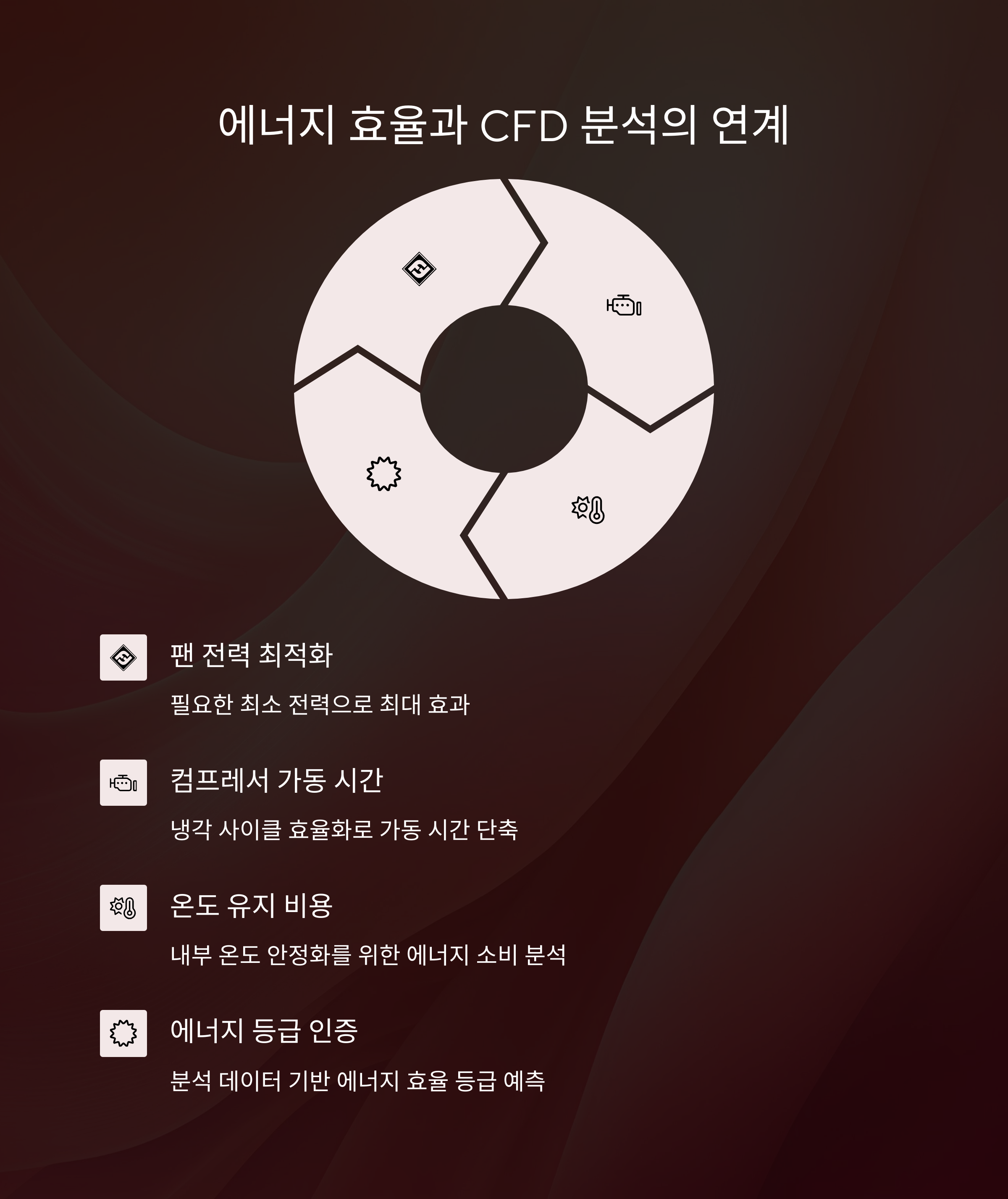 유동 해석의 궁극적인 목적은 에너지 효율 향상입니다. 팬의 소비 전력, 컴프레서 작동 시간, 내부 온도 유지 비용 등을 CFD 결과와 연계하여 다음과 같은 지표를 도출할 수 있습니다: