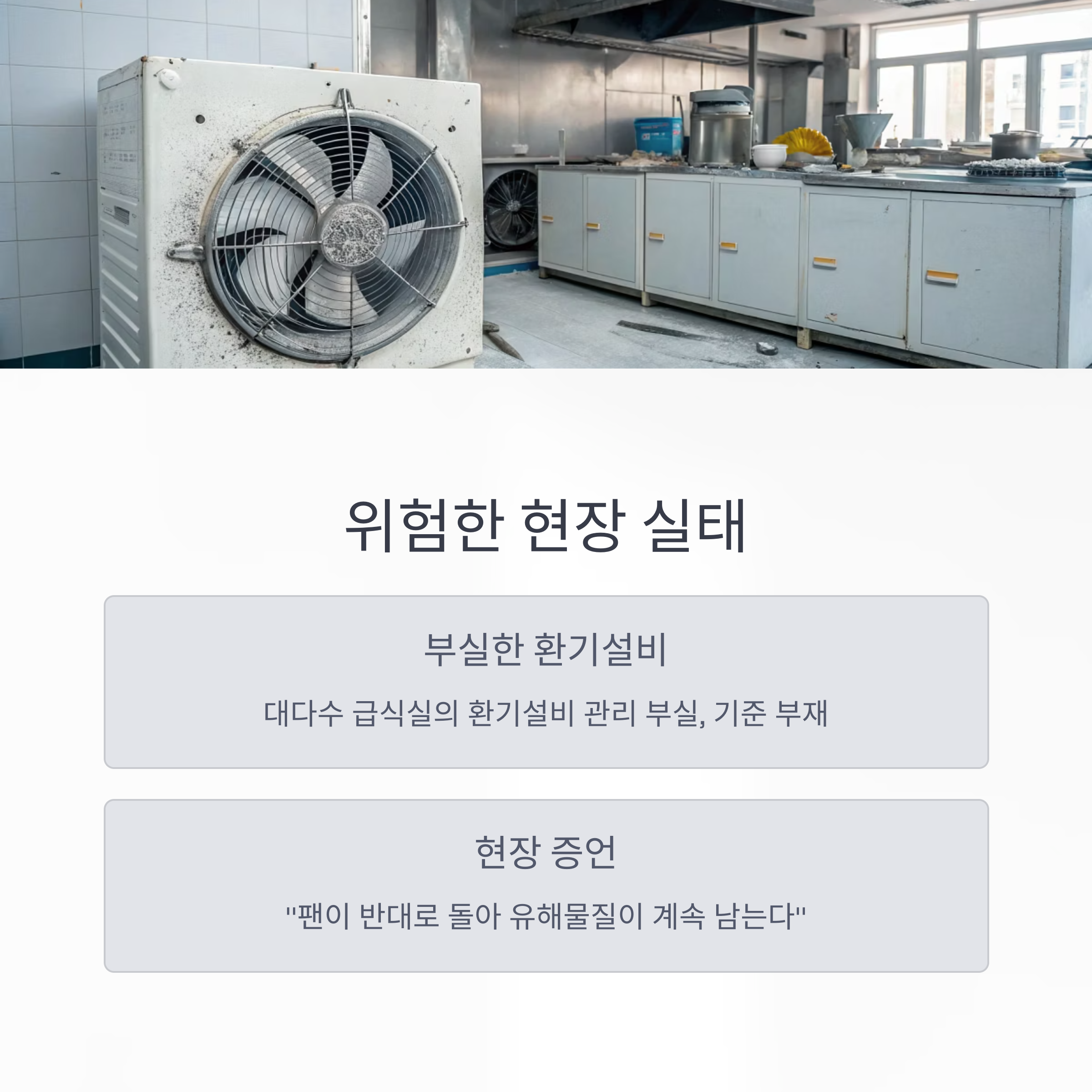 대다수 단체급식실의 환기설비는 부실한 관리와 기준 부재로 제 역할을 못하고 있습니다.