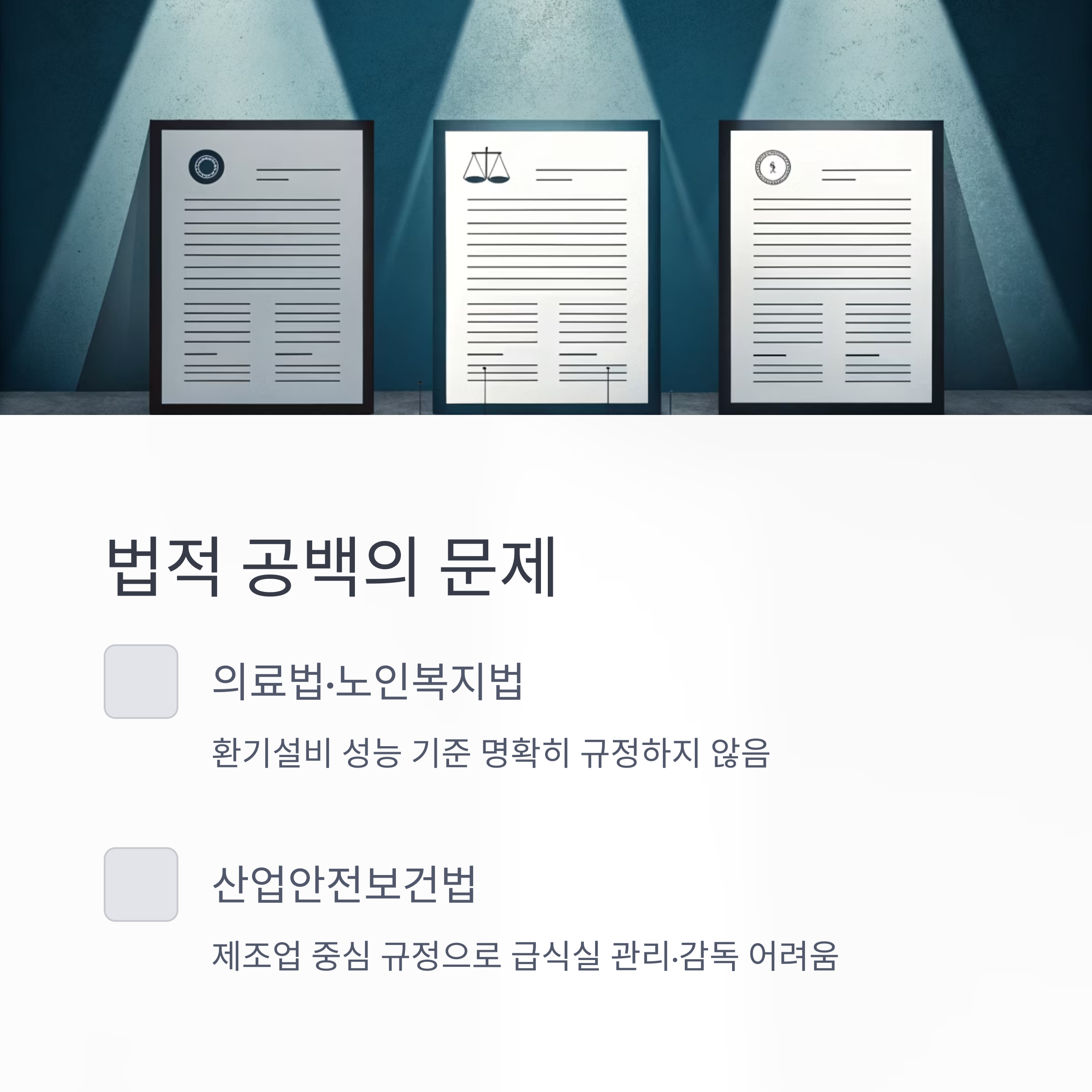 현행법상 의료법과 노인복지법은 환기설비의 성능 기준을 명확하게 규정하지 않고 있습니다.