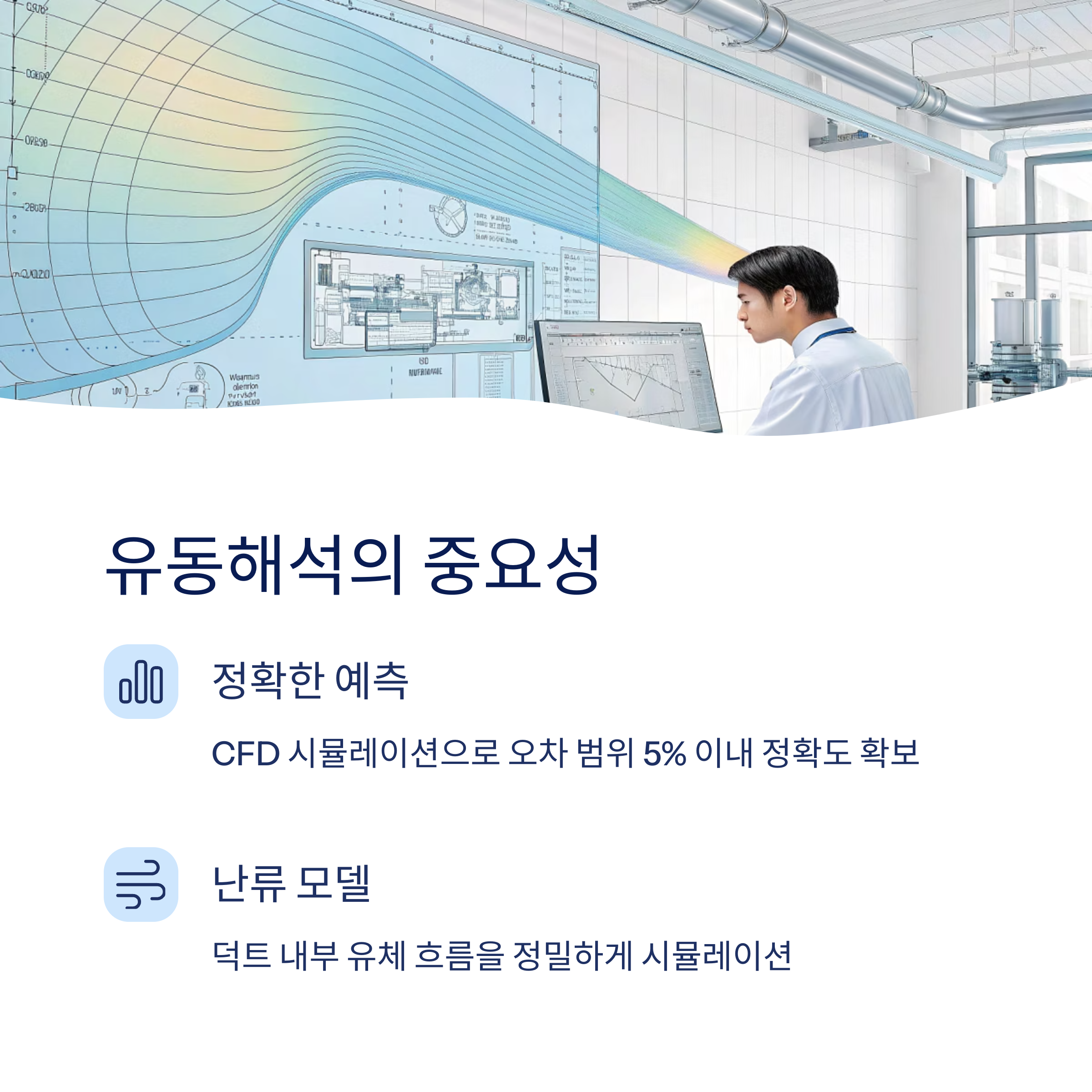 유동해석(CFD)은 덕트 내부 압력 손실을 예측하는 데 가장 널리 사용되는 기술입니다.