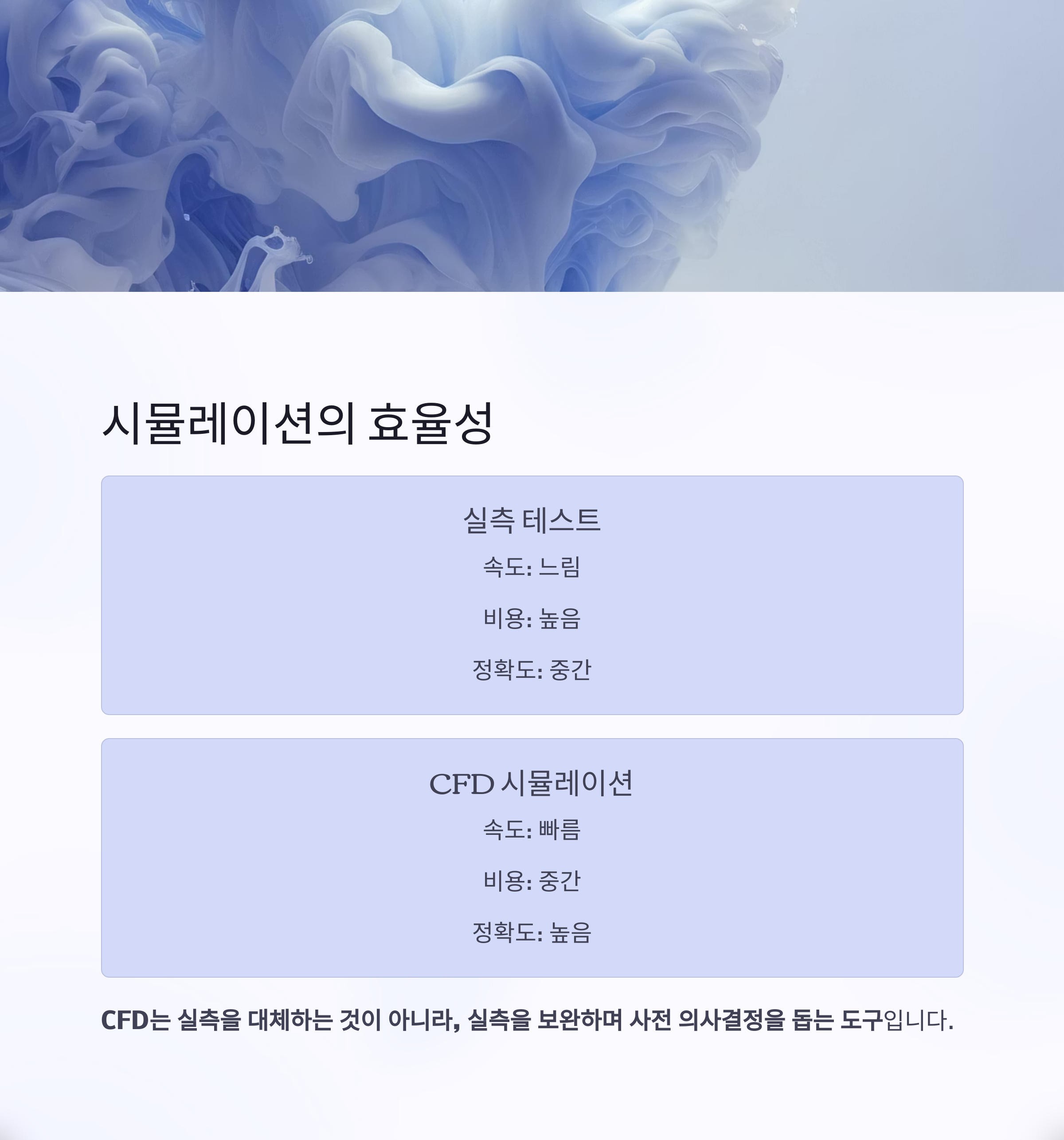 중요 포인트는 CFD가 실측을 대체하는 것이 아니라, 실측을 보완하며 사전 의사결정을 돕는 도구라는 점입니다.