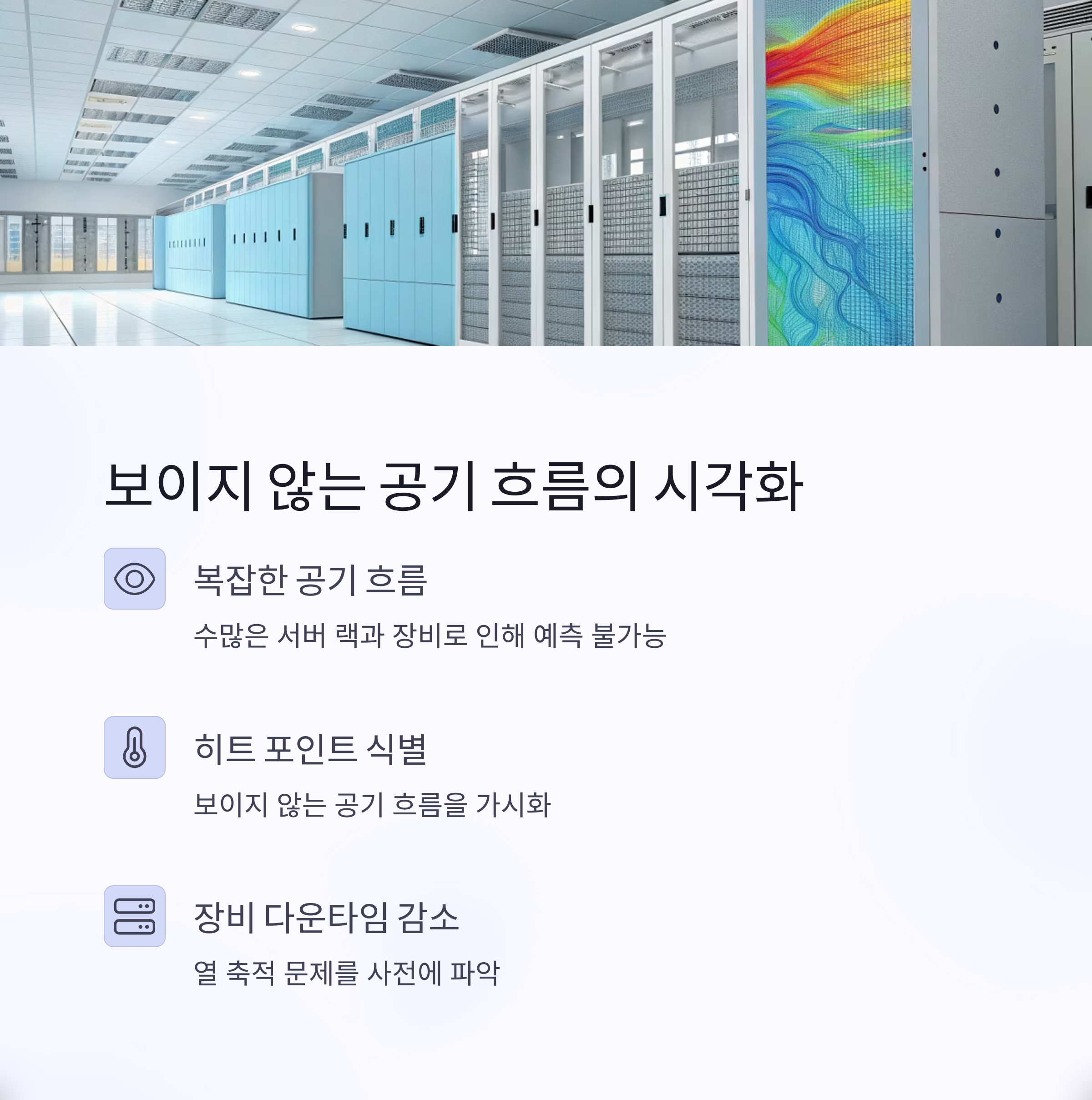 데이터센터는 수많은 서버 랙과 장비, 구조물로 구성되어 있어 공기의 흐름이 매우 복잡하고 예측 불가능합니다.