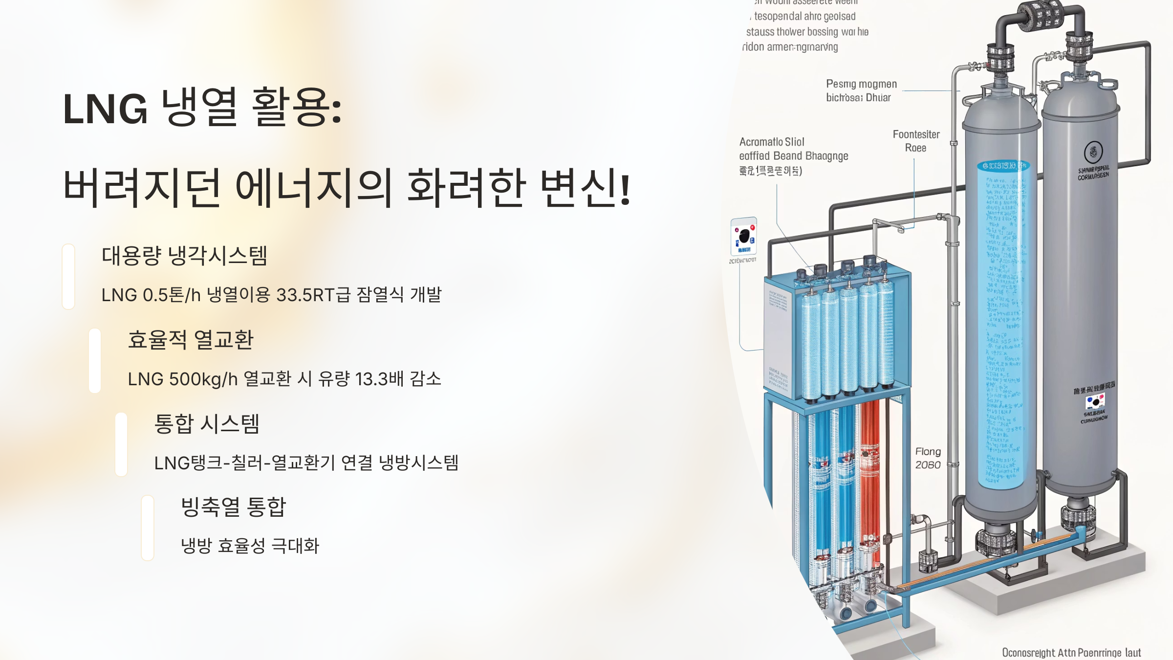 LNG 냉열을 활용하면 기존의 전기식 냉각 설비 가동을 크게 줄일 수 있어 에너지 소비와 탄소 배출량을 획기적으로 절감할 수 있습니다.