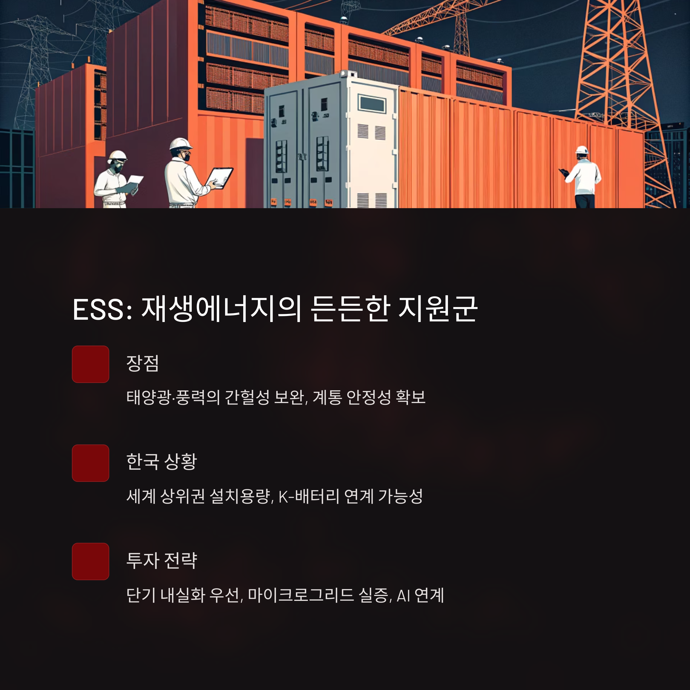 | ESS | 내화성 ESS 집중투자 | RE100 연계 ESS확대 | ESS+AI 자가망 산업화 |