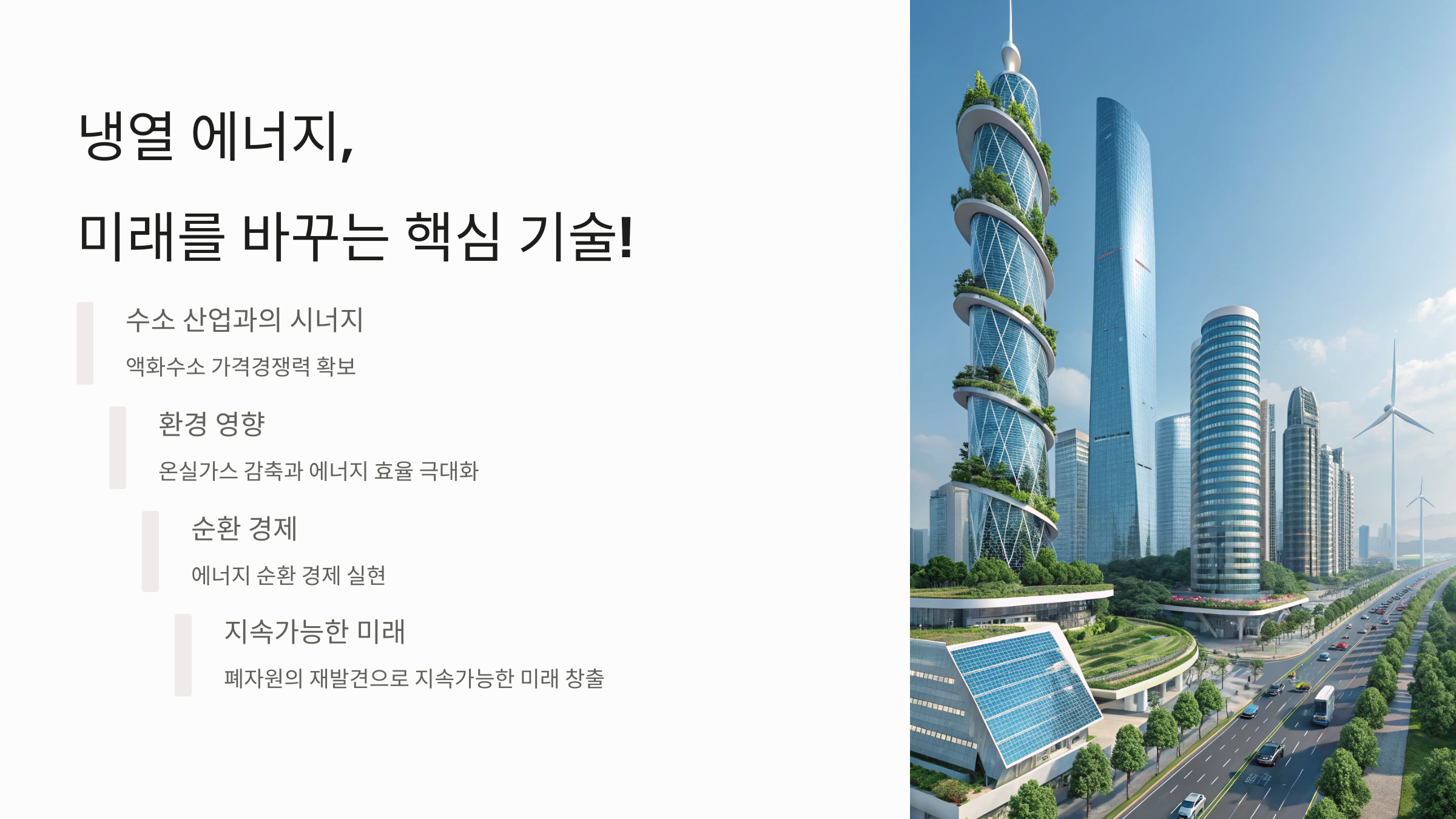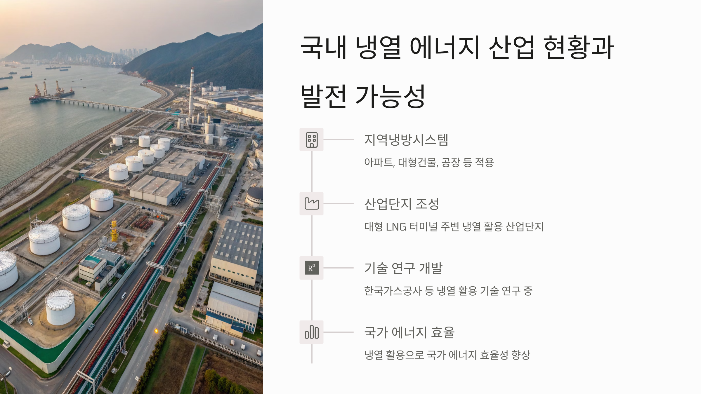 - ●신산업 창출: 냉열을 활용한 다양한 사업 모델 개발로 새로운 시장과 일자리를 만들 수 있습니다.