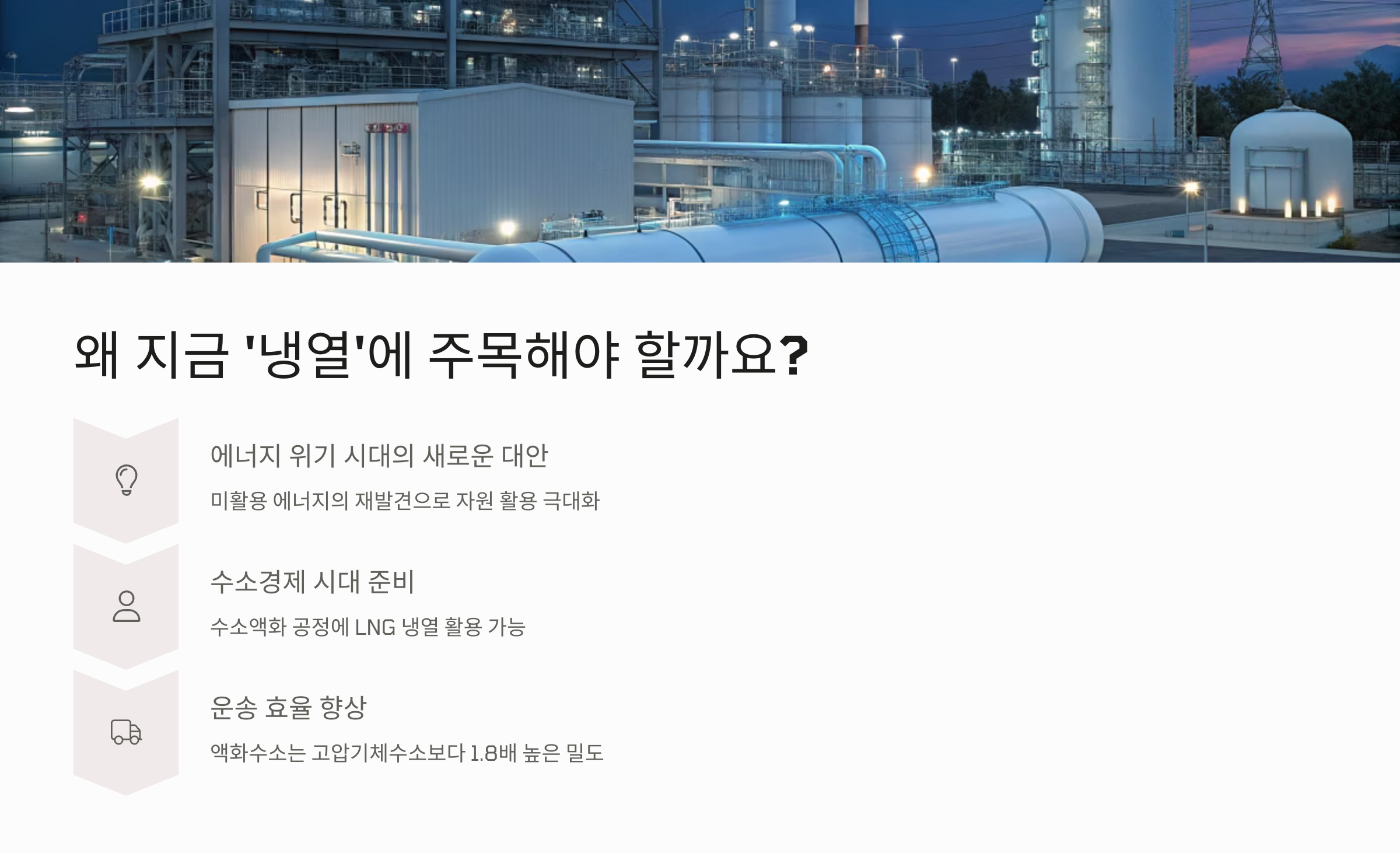예를 들어, 평택 LNG 인수기지 인근에는 국내 최대 규모의 냉열 활용 냉동 물류단지가 조성되어 운영 효율을 높이고 있구요.