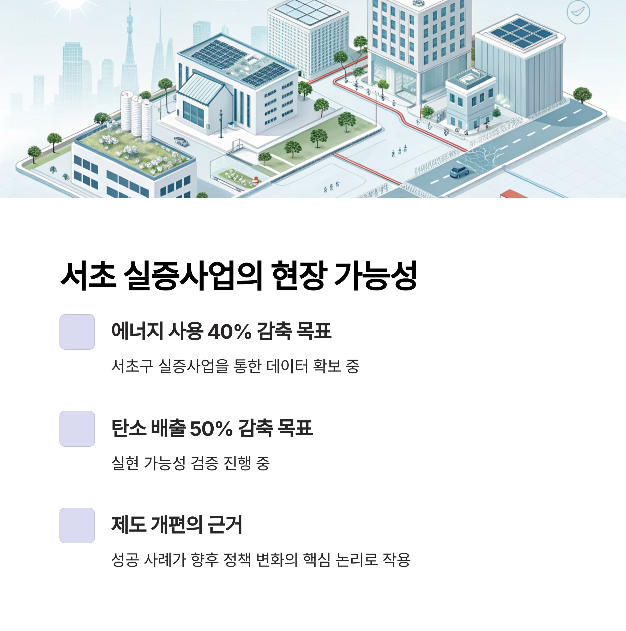실제 서울 서초구에서 진행 중인 실증사업은 에너지 사용 40%, 탄소 배출 50% 감축을 목표로 진행되고 있으며, 이를 통해 실현 가능성과 데이터 기반 근거 확보가 진행 중입니다.