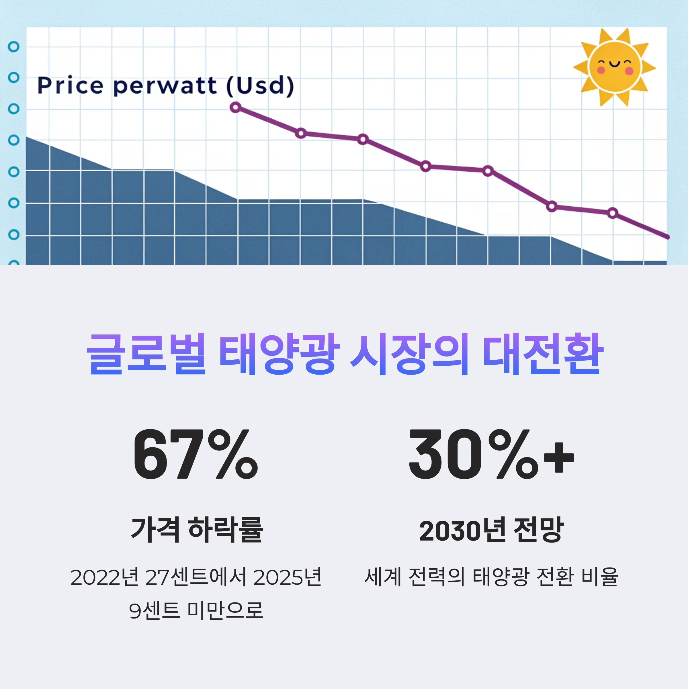 2025년 기준 태양광 모듈 가격이 W당 9센트 미만으로 하락하며, 2022년 대비 67%나 낮아졌습니다.