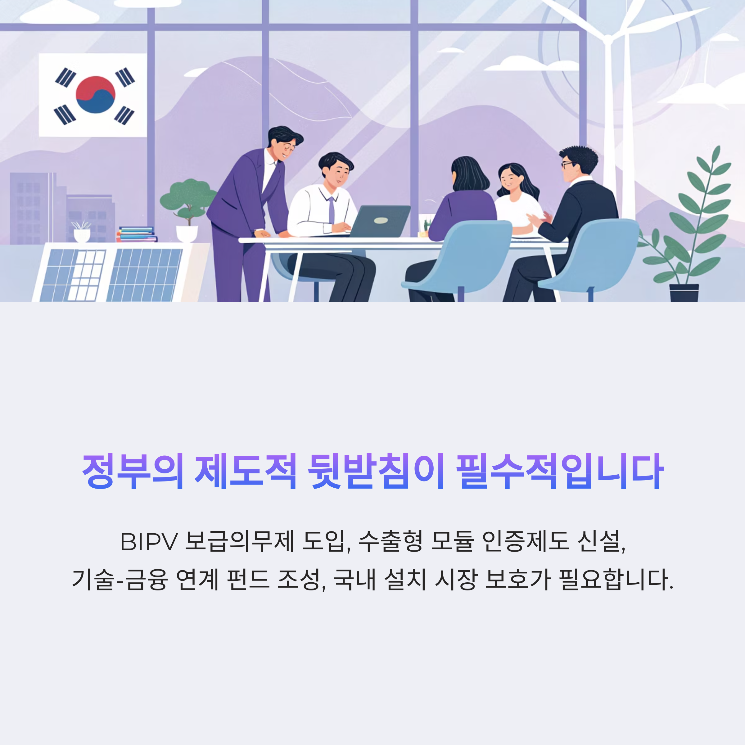 따라서 단순 설치 확대가 아니라, "한국형 기술·소재·BIPV 중심의 고부가가치 구조 전환"이 필요합니다.