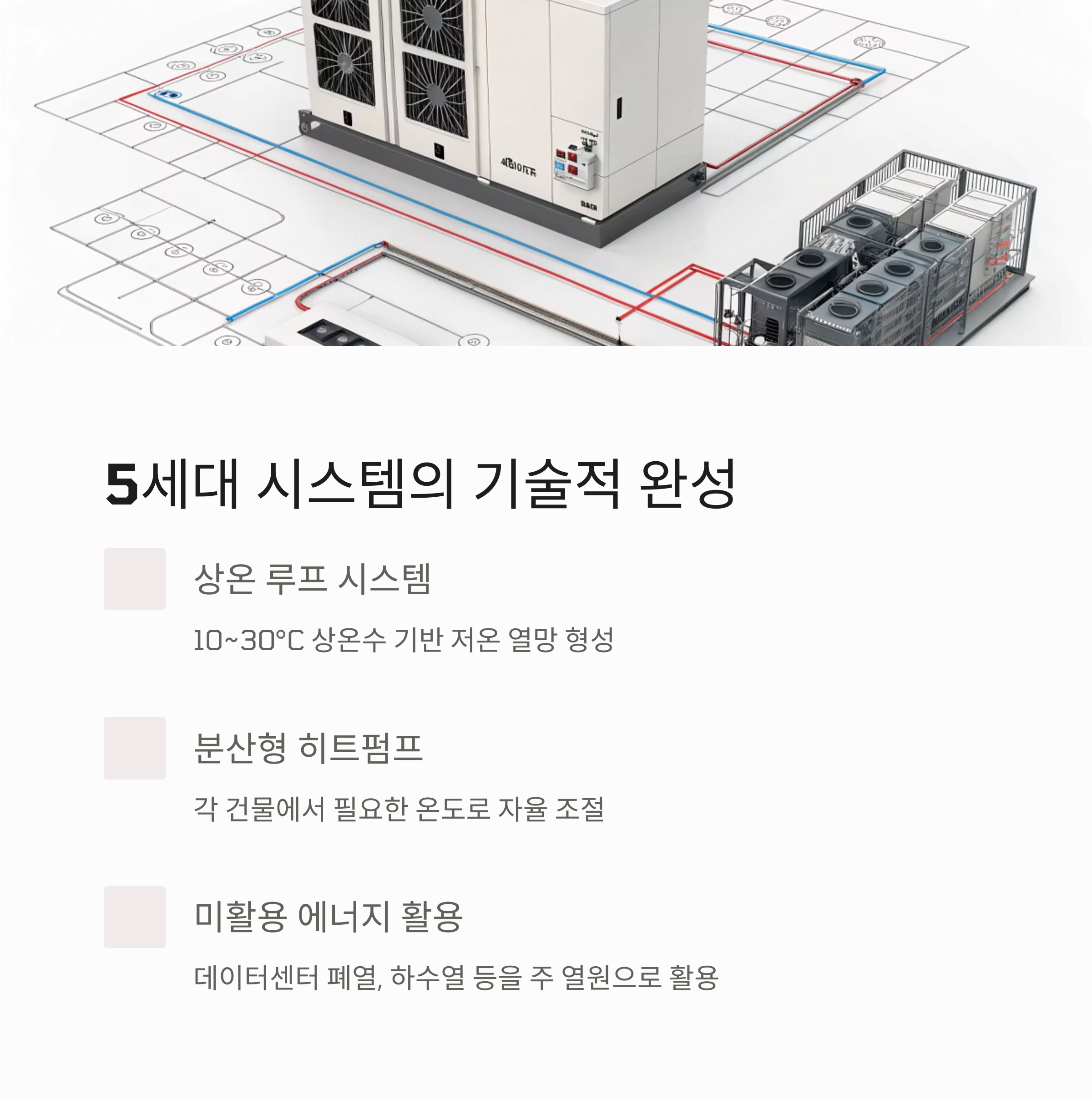 5세대 시스템은 10~30°C의 상온수를 기반으로, 건물 간 열 교환이 가능한 저온 열망을 형성합니다.