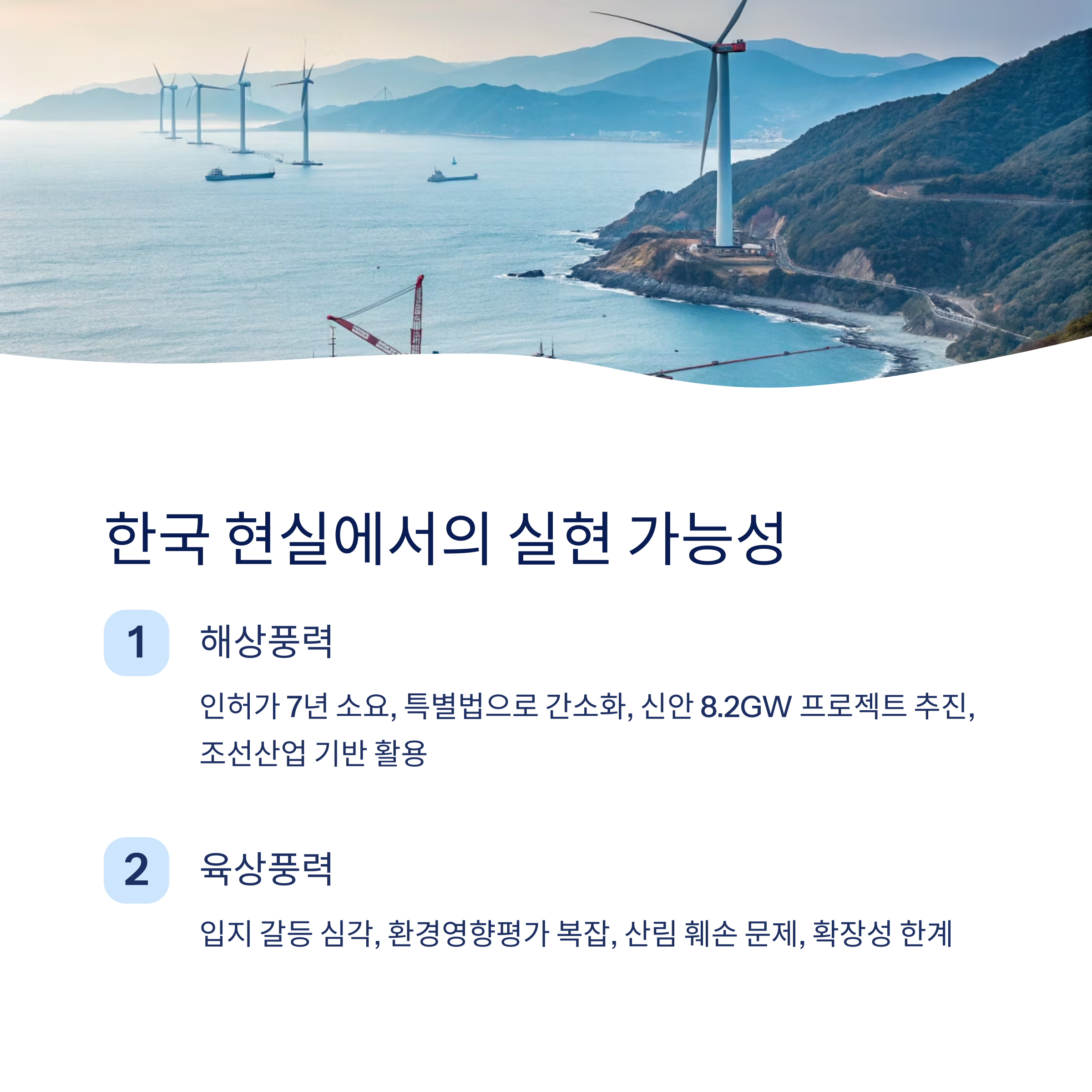 한국은 지형적 한계와 주민 수용성 문제로 인해 육상풍력 확장이 쉽지 않으며, 해상풍력 중심 전략이 보다 현실적입니다.