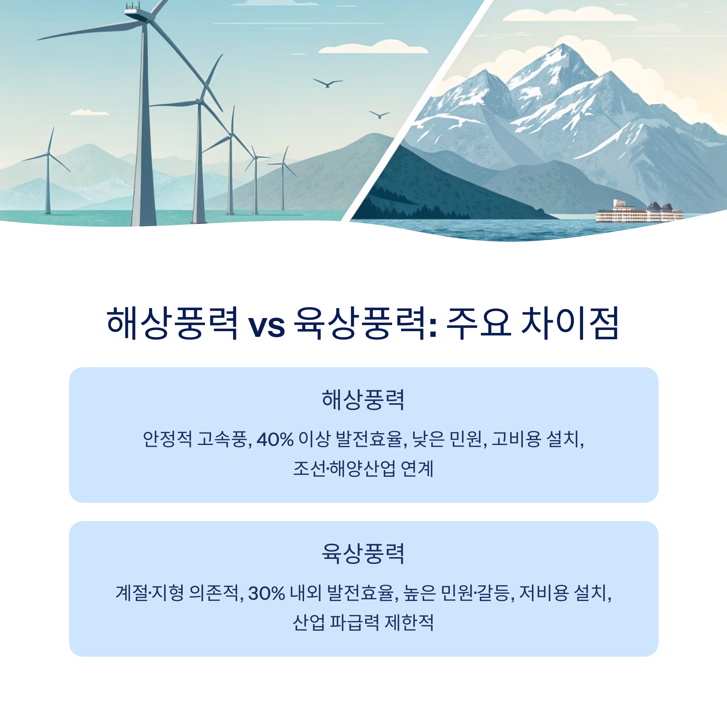 정책, 입지, 산업 생태계, 수용성 측면에서 분석하면, 해상풍력이 중장기적으로 더 유망하지만, 육상풍력도 전략적으로 병행해야 할 필요가 있습니다.