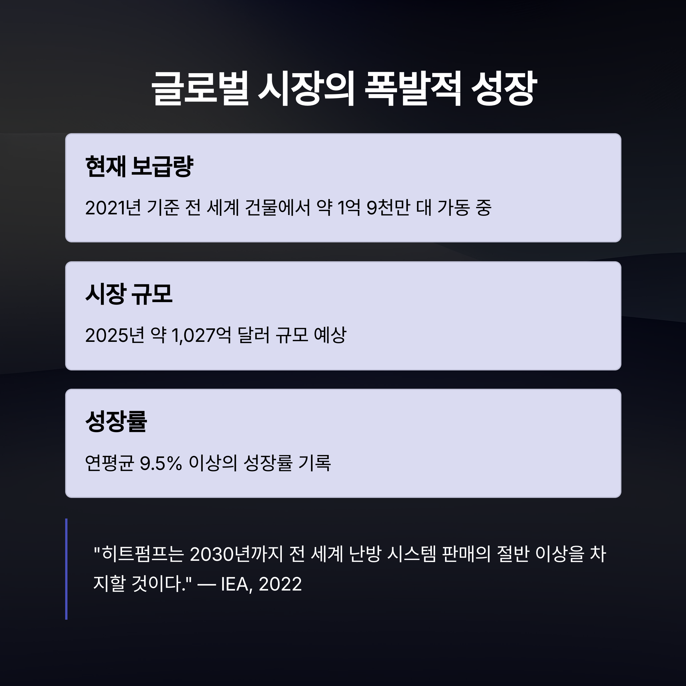 IEA에 따르면 2021년 기준 전 세계 건물에서 약 1억 9천만 대의 히트펌프가 가동 중이며, 2025년에는 약 1,027억 달러 규모로 평가되고 있습니다. 이 시장은 연평균 9.5% 이상의 성장률을 기록하며 2037년에는 3,100억 달러를 넘을 것으로 전망되고 있죠.