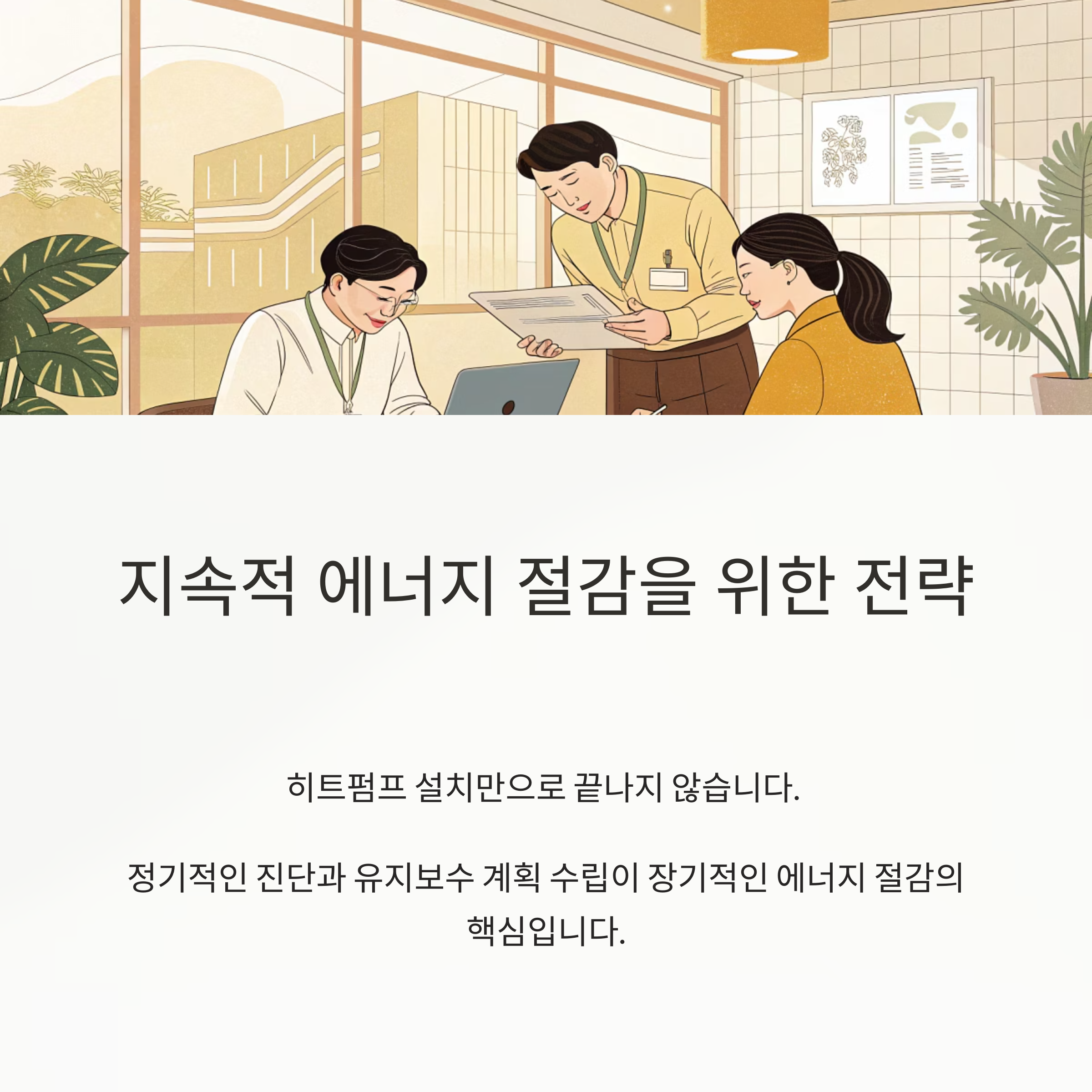 히트펌프 설치만으로 끝나는 것이 아니라, 정기 진단 및 유지보수 계획 수립이 중요합니다..