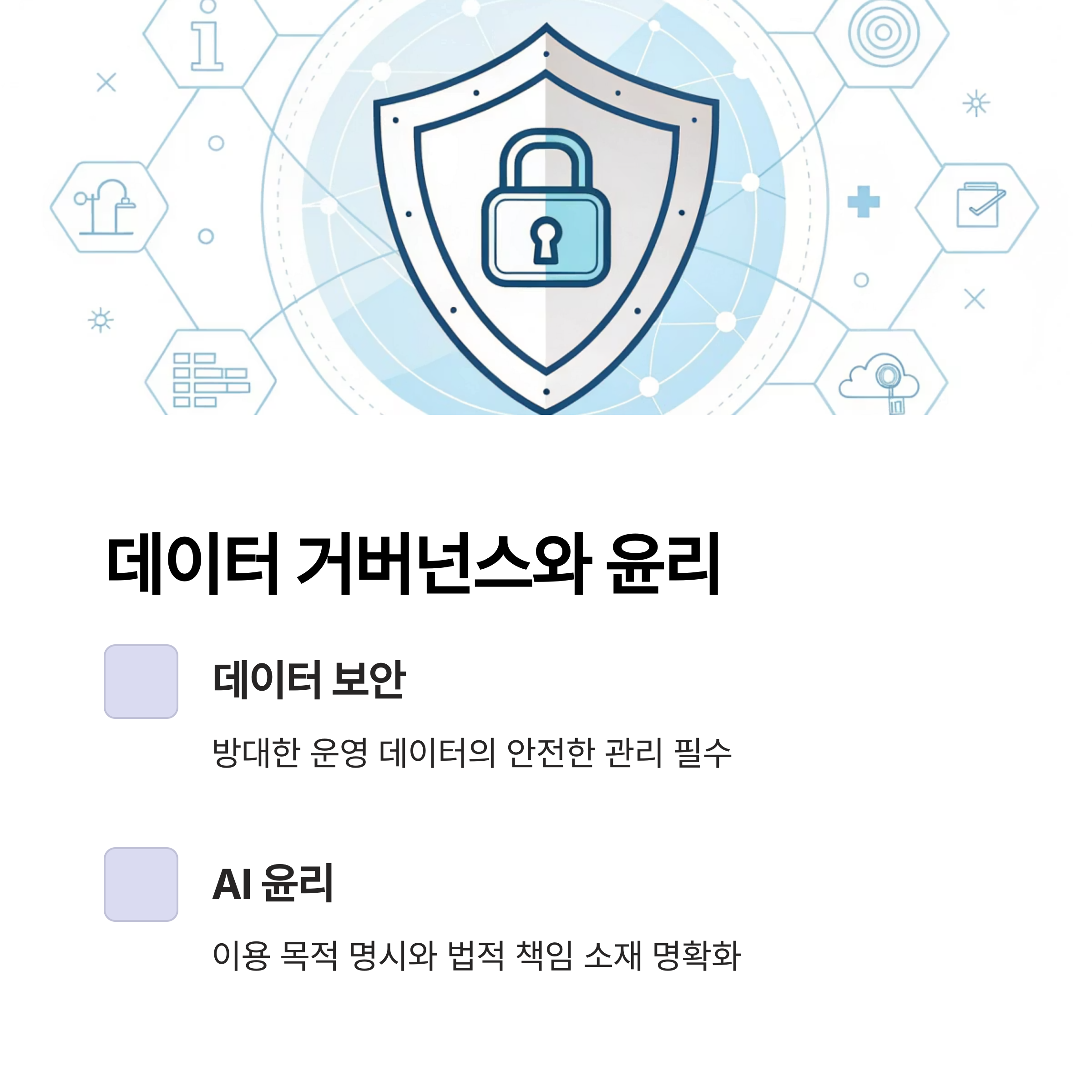 CAE 기반 디지털 트윈은 방대한 운영 데이터를 필요로 하며 데이터 보안, AI 윤리, 이용 목적 명시 등의 원칙을 지켜야 한다.