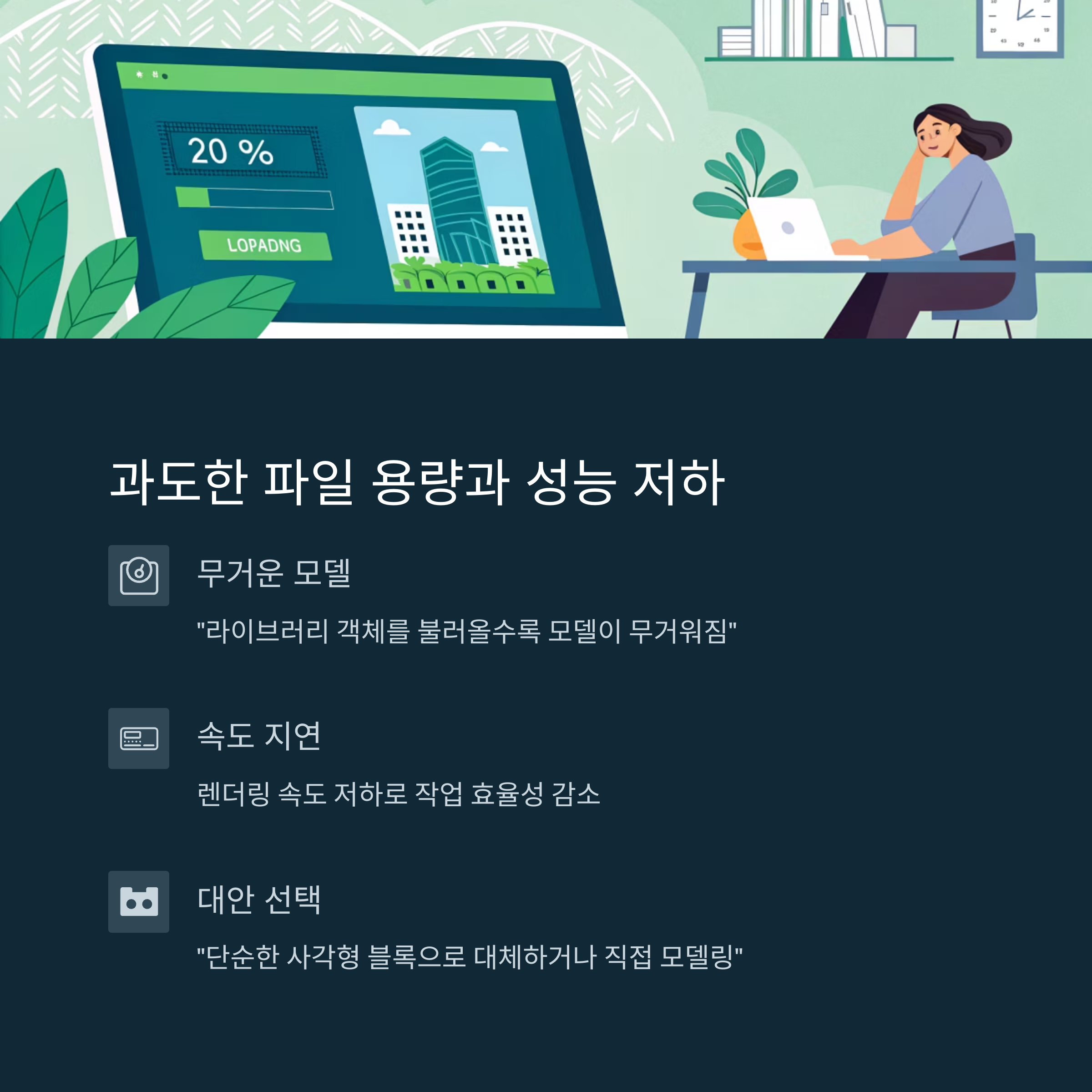 실무자들은 "라이브러리 객체를 불러올수록 모델이 무거워지고 속도가 느려진다"고 불만을 토로합니다.