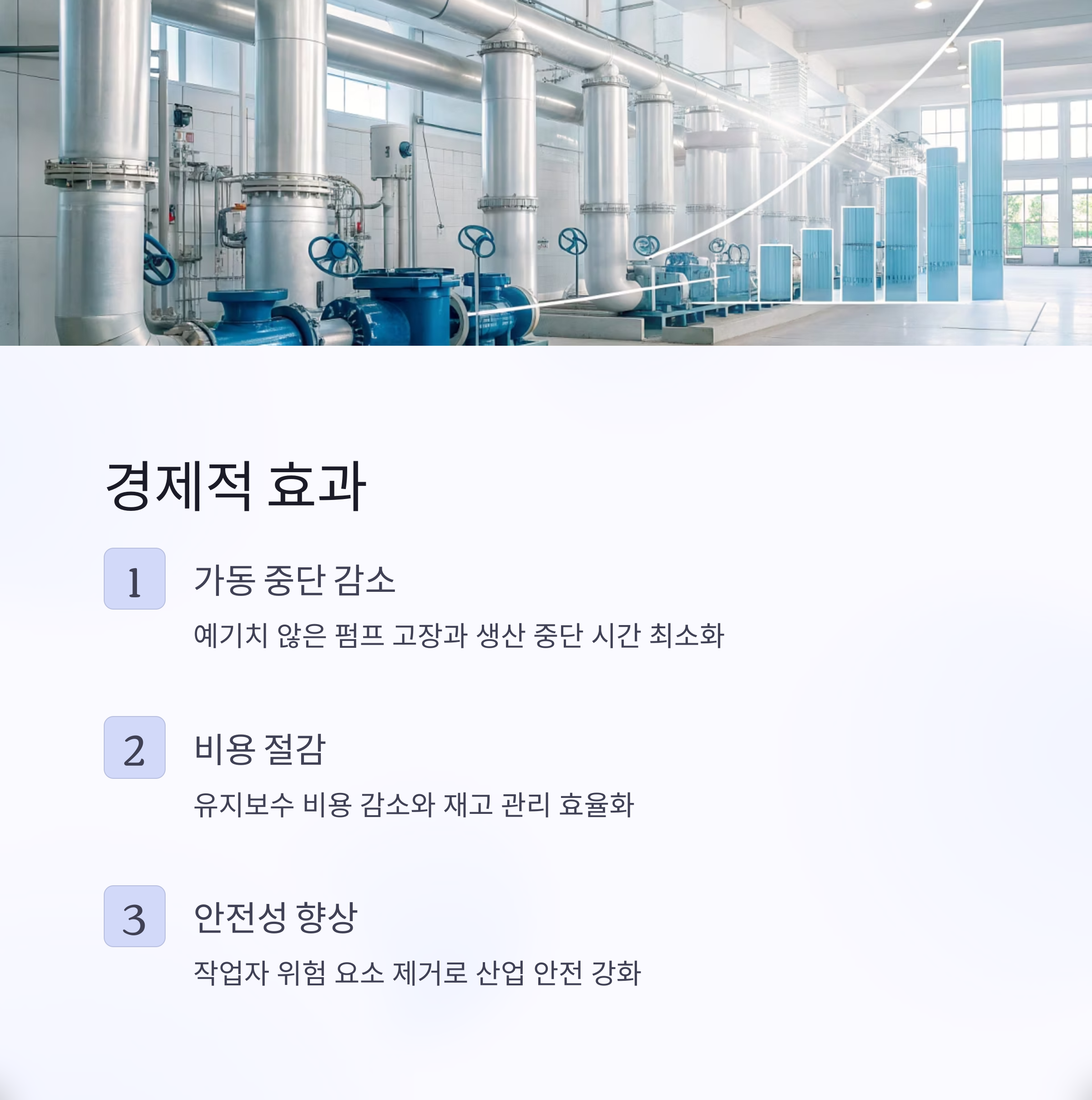 캐비테이션 문제 조기 진단과 설계 개선은 예기치 않은 펌프 고장과 가동 중단 시간을 크게 줄이며, 유지보수 비용 절감과 재고 관리 효율화를 가능하게 합니다. 더불어 작업자의 안전 위험도 감소시키는 효과가 있습니다.