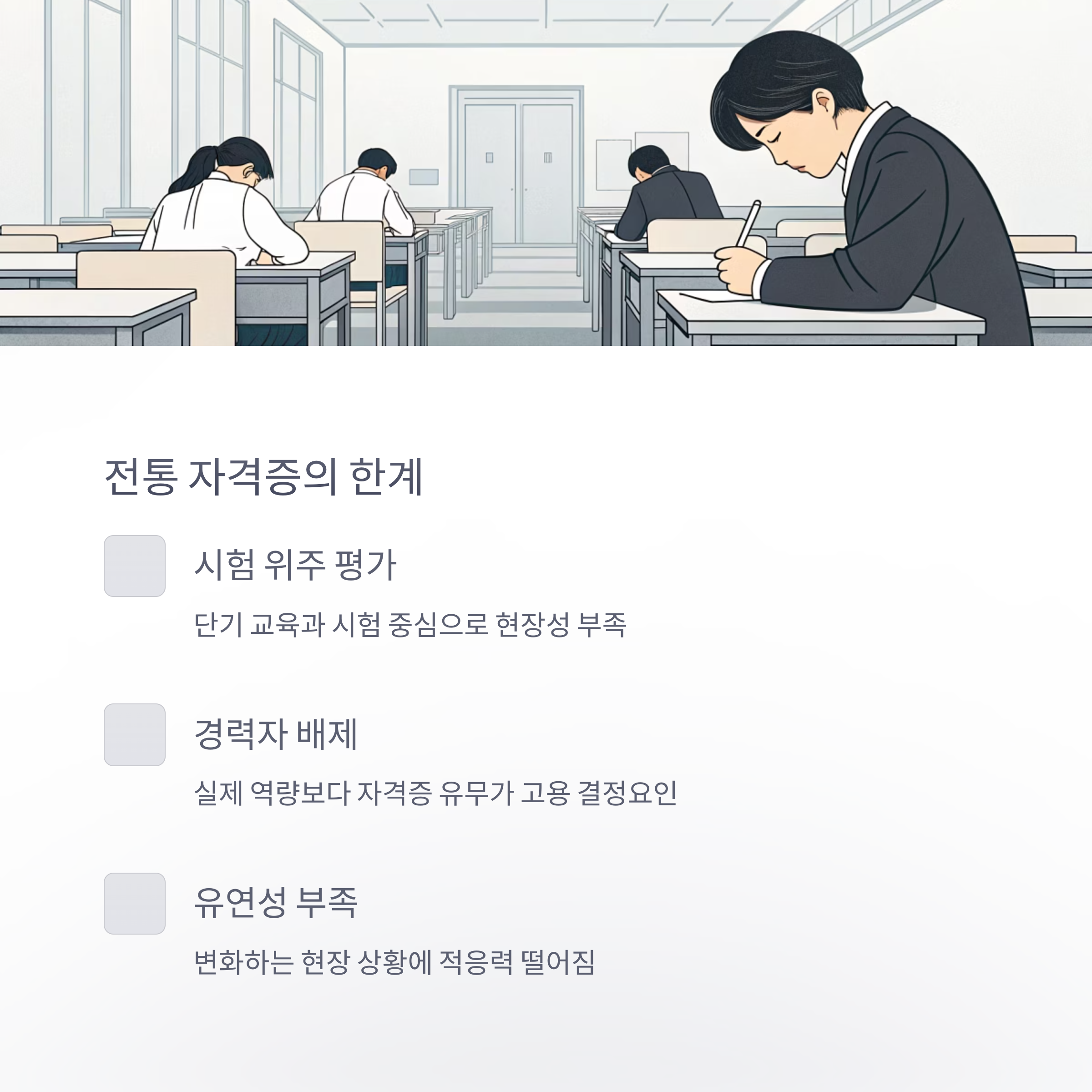 전통 자격증은 기술자의 직관이나 경험을 증명할 수 없습니다.