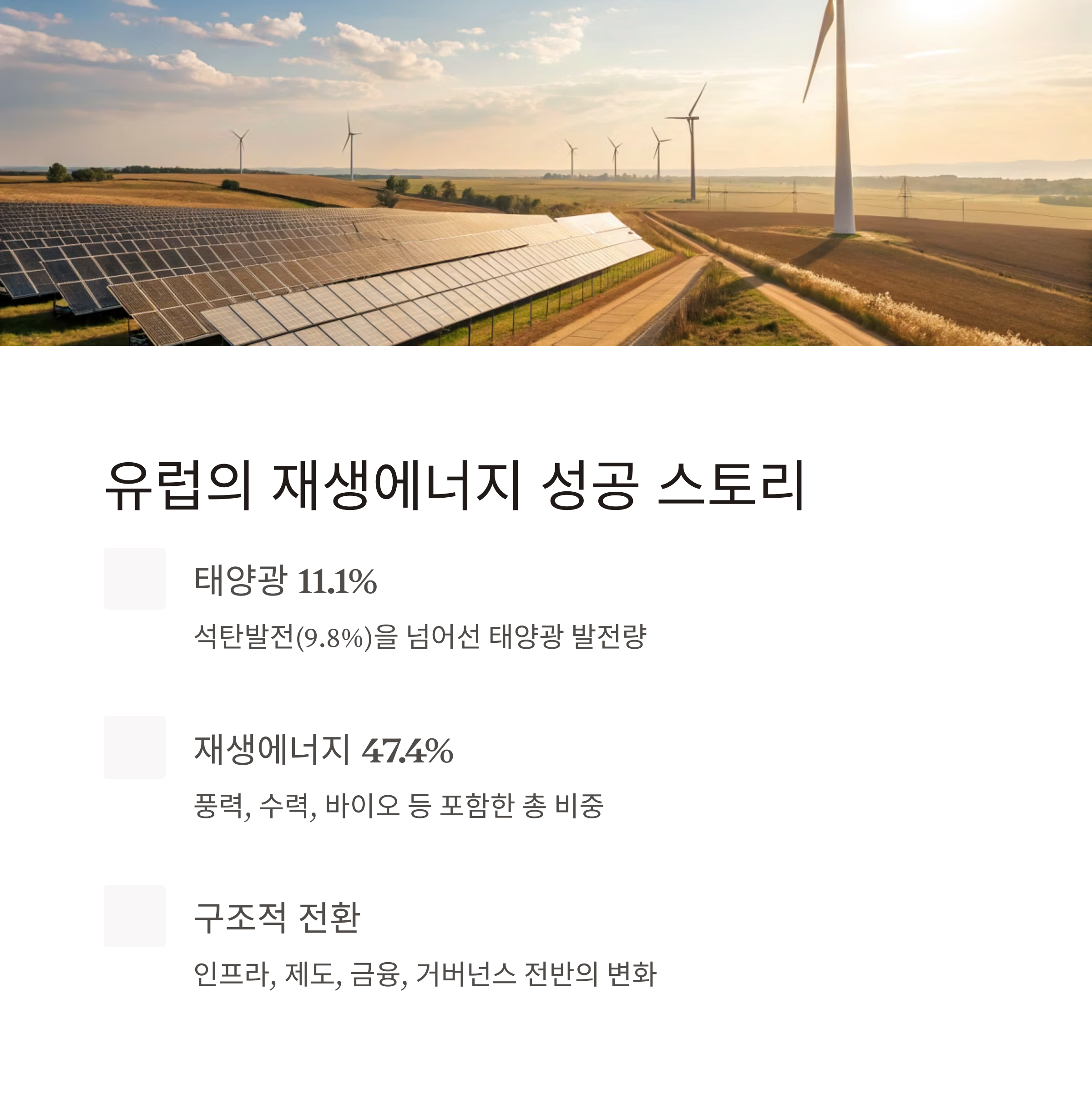 유럽연합(EU)은 2024년 전체 전력의 47.4%를 재생에너지로 충당하며, 석탄을 공식적으로 추월한 구조적 전환을 이뤘습니다.