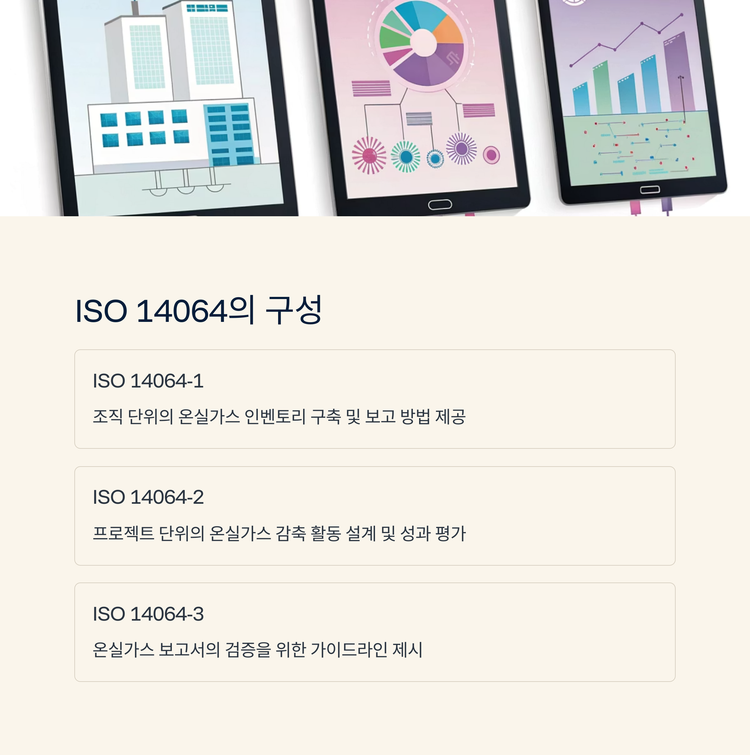 | ISO 14064 표준의 구성 | 3개 파트 (조직, 프로젝트, 검증) |